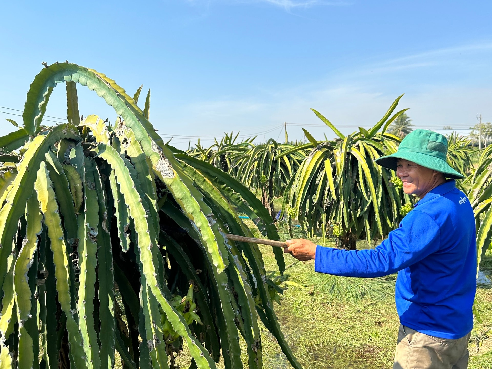 Nông dân Lê Văn Bình chăm sóc thanh long sau tết