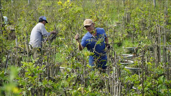 Người trồng mai tất bật với công đoạn tỉa cành, lặt lá mai.