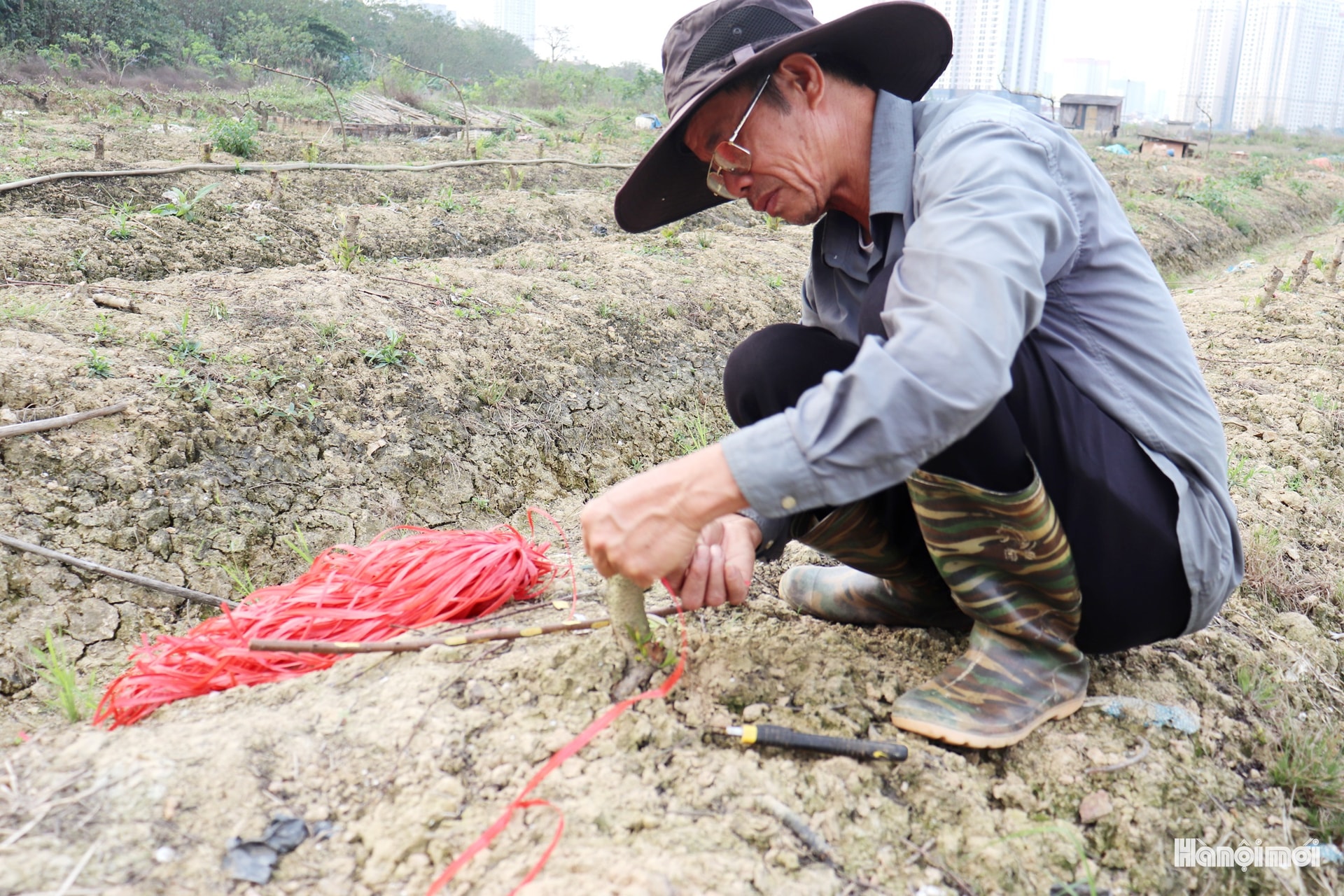Nhà vườn tiến hành tưới bổ sung nước vào từng gốc để cây nhanh chóng hồi phục. Sau đó các cây đào sẽ được đưa xuống trồng lại xuống đất. Ảnh: Tuấn Điệp
