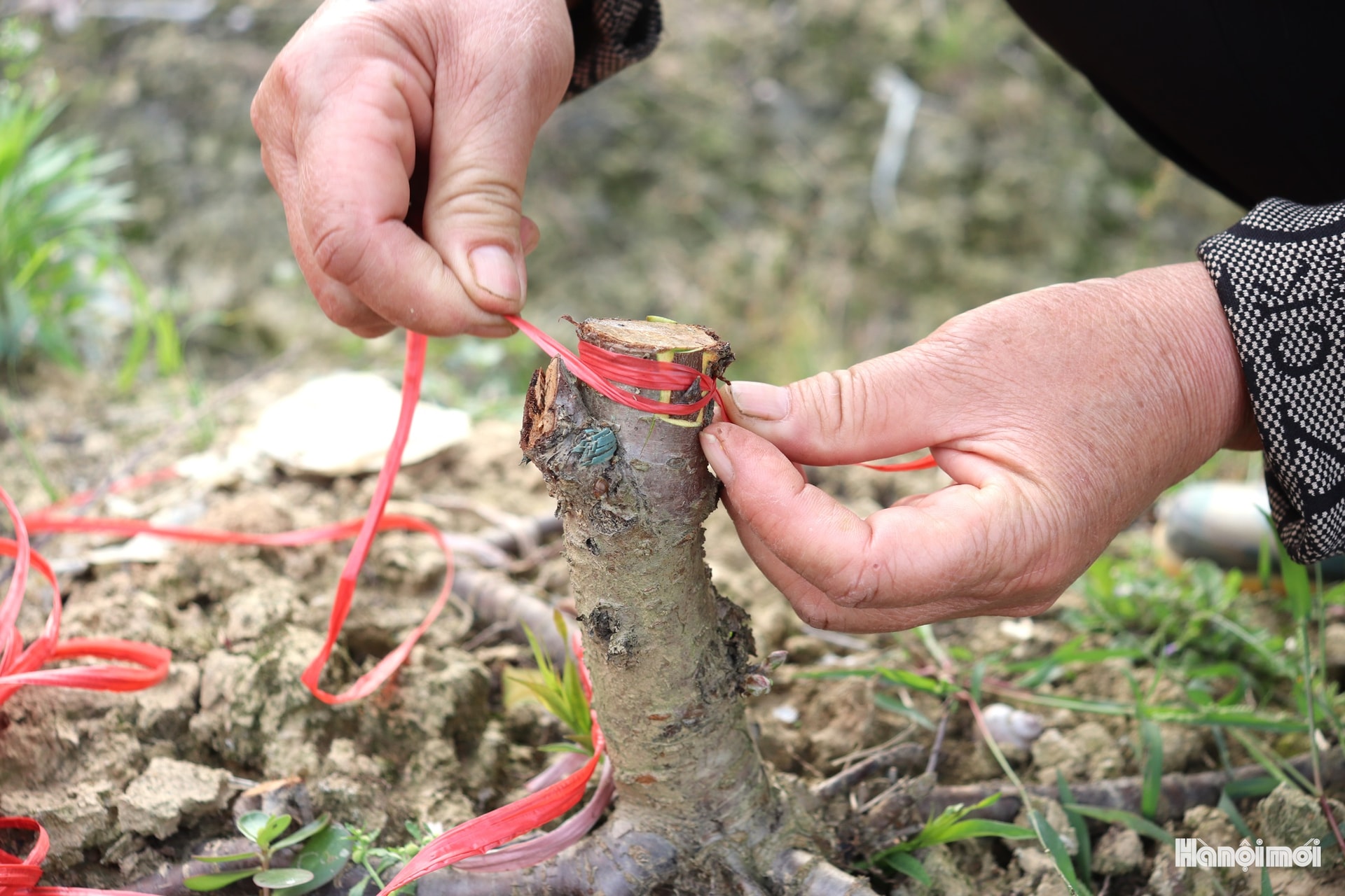 Vợ chồng ông Dân tập trung ghép mắt mới vào các gốc đào khỏe mạnh. Sau khi ghép khoảng 15 ngày, các mắt ghép bắt đầu bám chắc vào thân cây, dần hình thành chồi mới. Ảnh: Tuấn Điệp