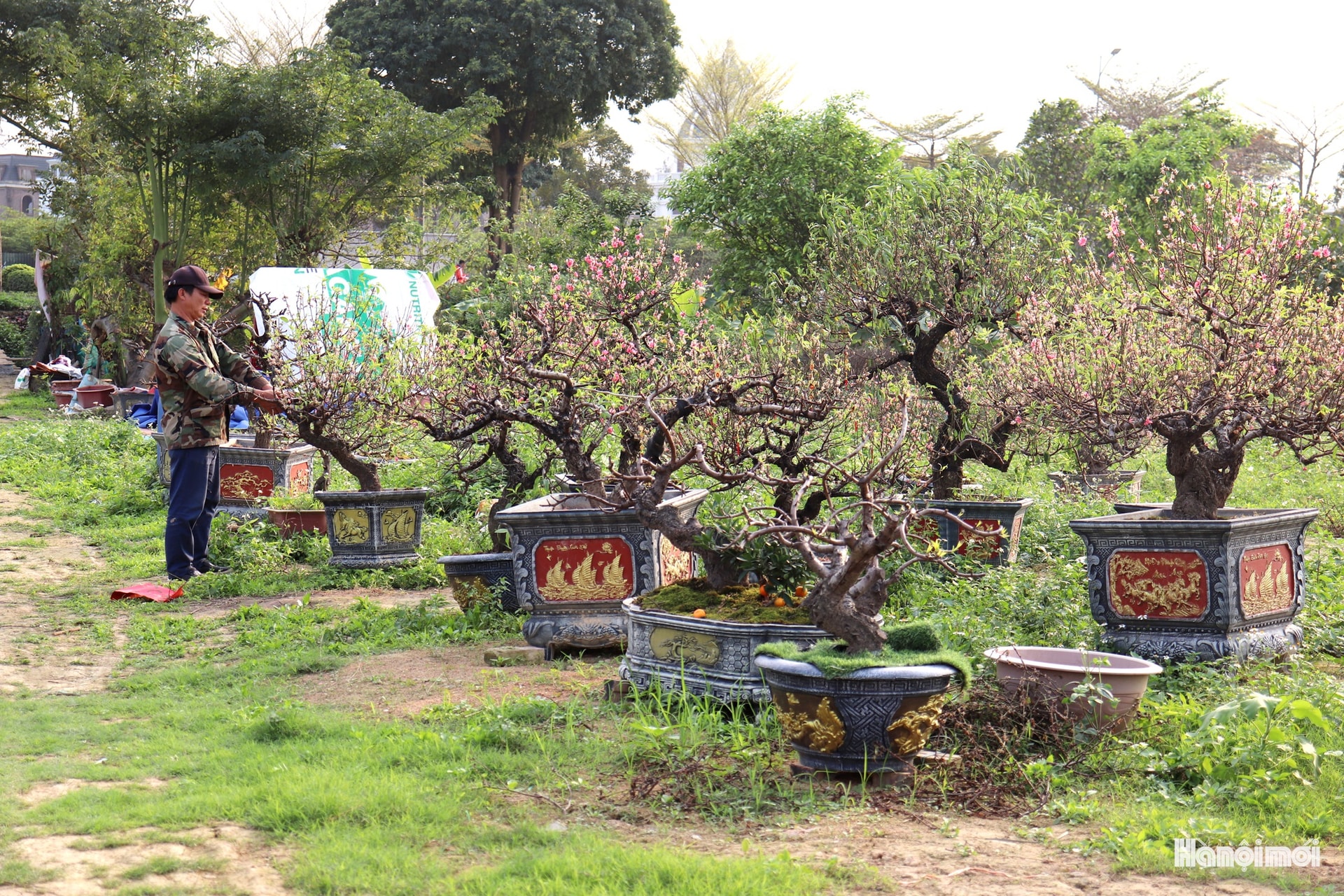 Sau Tết, nhiều gốc đào khách thuê được tập kết về vườn ông Toàn để bắt đầu quá trình cắt tỉa cành, phục hồi cây. Ảnh: Tuấn Điệp