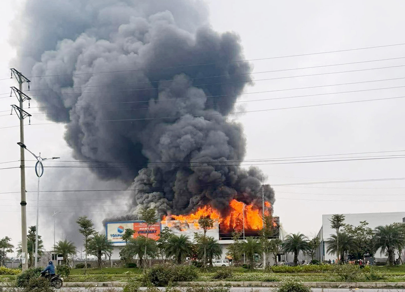 Khoảng 8h40, ngọn lửa bất ngờ bùng phát bên trong nhà xưởng, sau đó lan rộng bao trùm toàn bộ khu vực. Cột khói đen cuồn cuộn bốc cao hàng chục mét.