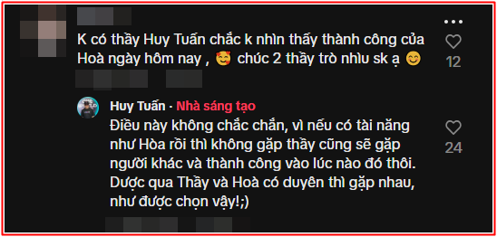 Bên dưới đoạn clip được Huy Tuấn chia sẻ, nhiều khán giả đã lại bình luận bày tỏ sự ngưỡng mộ trước mối quan hệ thầy trò đầy tình cảm giữa anh và Hòa Minzy. Ý kiến này viết: "Không có thầy Huy Tuấn chắc không nhìn thấy thành công của Hòa ngày hôm nay, chúc 2 thầy trò nhiều sức khỏe ạ".