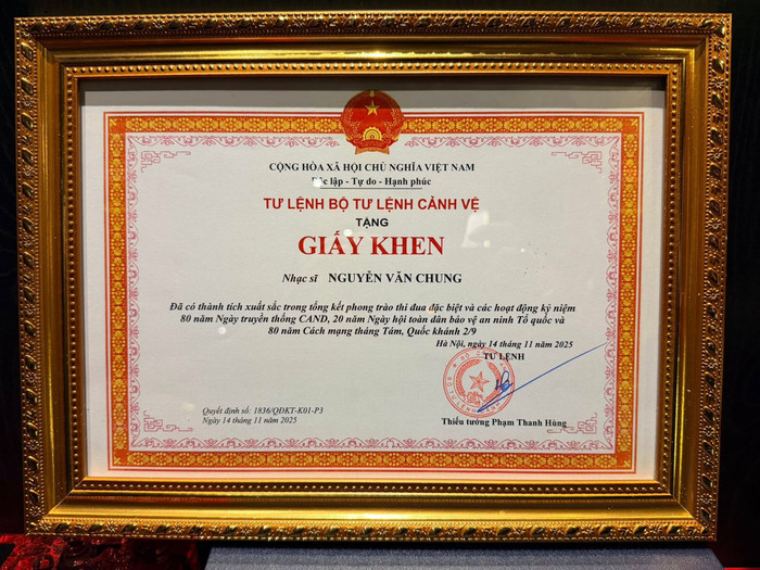 Nhạc sĩ Nguyễn Văn Chung vinh dự được nhận Giấy khen của Bộ Tư lệnh Cảnh vệ (Ảnh: FBNV).