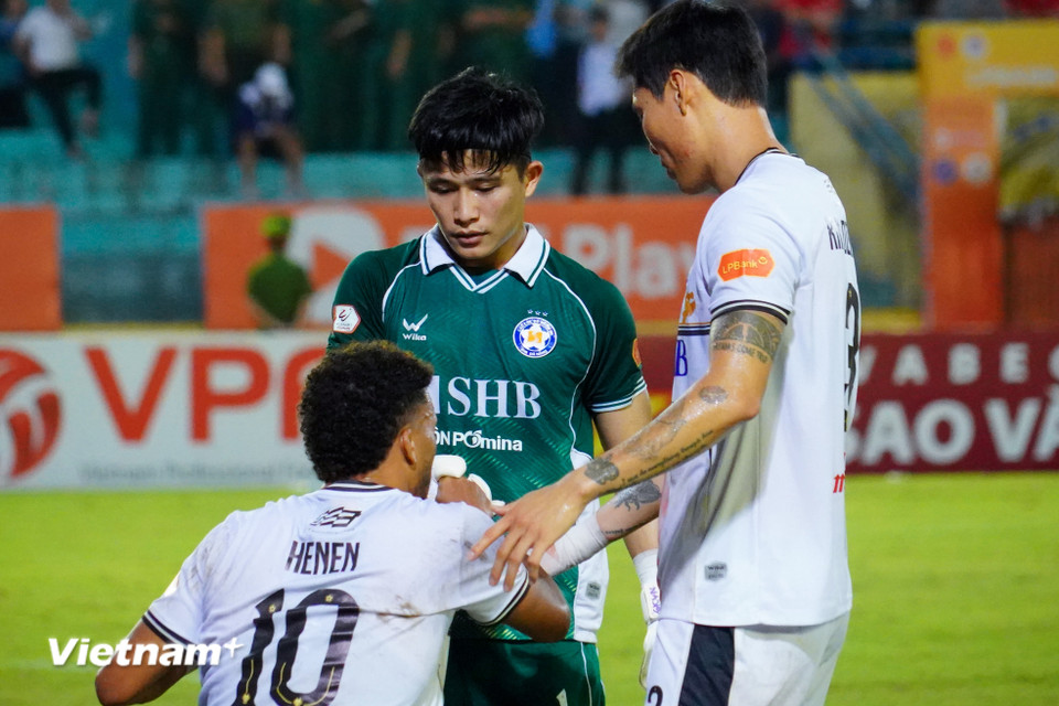 Đội khách SHB Đà Nẵng chịu tổn thất chỉ sau hơn 15 phút bóng lăn, khi thủ thành Bùi Tiến Dũng (áo xanh) gặp chấn thương sau pha va chạm với tiền đạo Lucao bên phía Thể Công. (Ảnh: Việt Anh/Vietnam+)