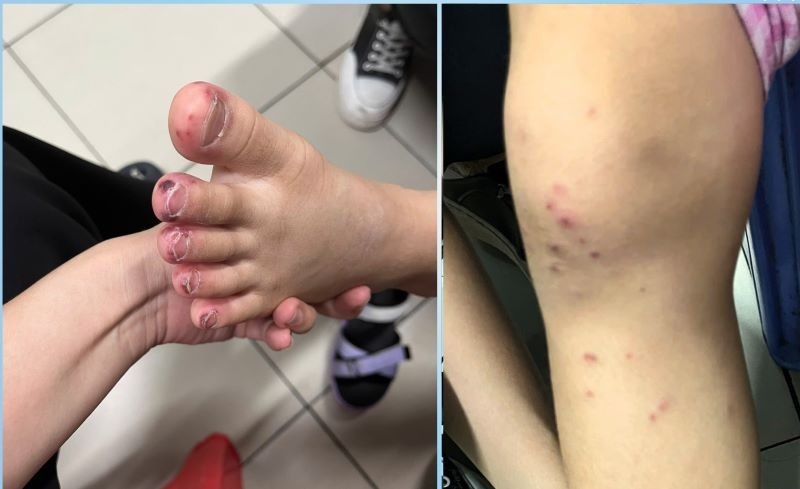 Tại thời điểm khám, trẻ trong tình trạng mệt mỏi, sốt 38°C, ban đỏ lan rộng toàn thân và vùng mặt, loét miệng và vẫn còn các nốt tím ở đầu ngón chân. Tại đây, các bác sĩ đã nghĩ đến nhiều chẩn đoán có thể như nhiễm trùng huyết, bệnh Kawasaki, và các bệnh tự miễn bao gồm lupus.