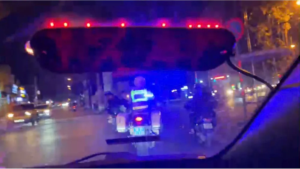 Cán bộ Đội CSGT Rạch Chiếc dùng xe đặc chủng mở còi hú, đèn ưu tiên dẫn xe chở bệnh viện đến bệnh viện Thủ Đức. Ảnh cắt từ clip.