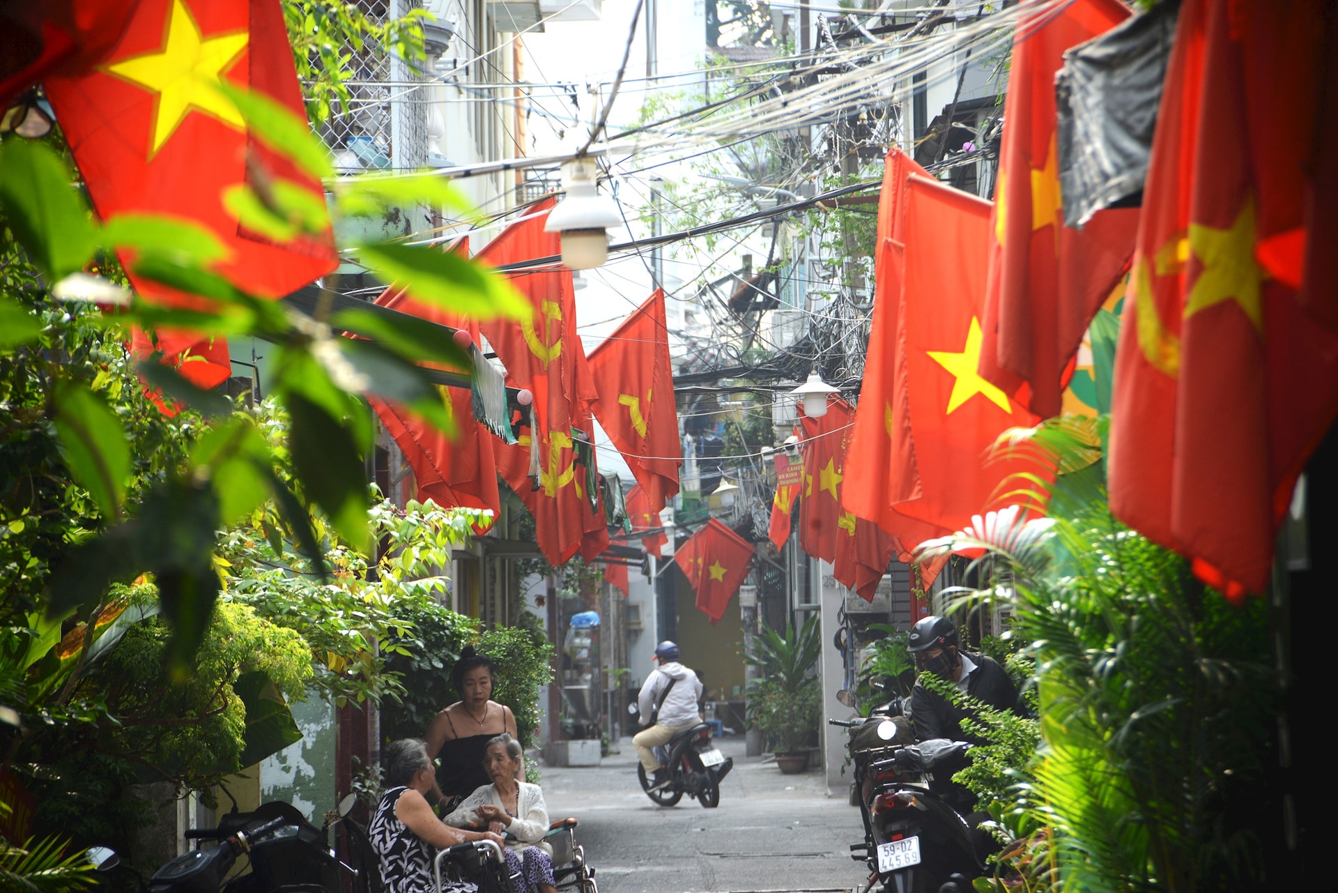 Một khu dân cư tại phường Bến Thành, thành phố Hồ Chí Minh rợp cờ hoa chào mừng Đại hội Đảng. Ảnh: Tùng Lâm