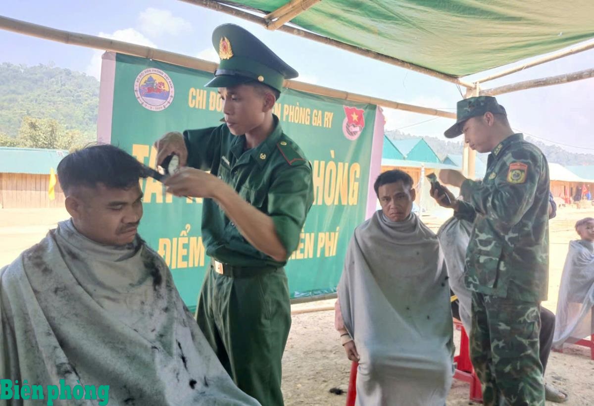 Tổ Tay kéo Biên phòng Đồn Biên phòng Ga Ry cắt tóc miễn phí cho người dân Lào. Ảnh: Trúc Hà