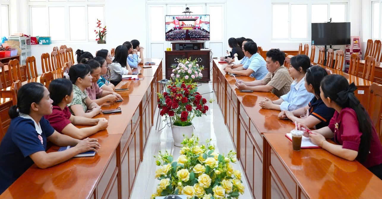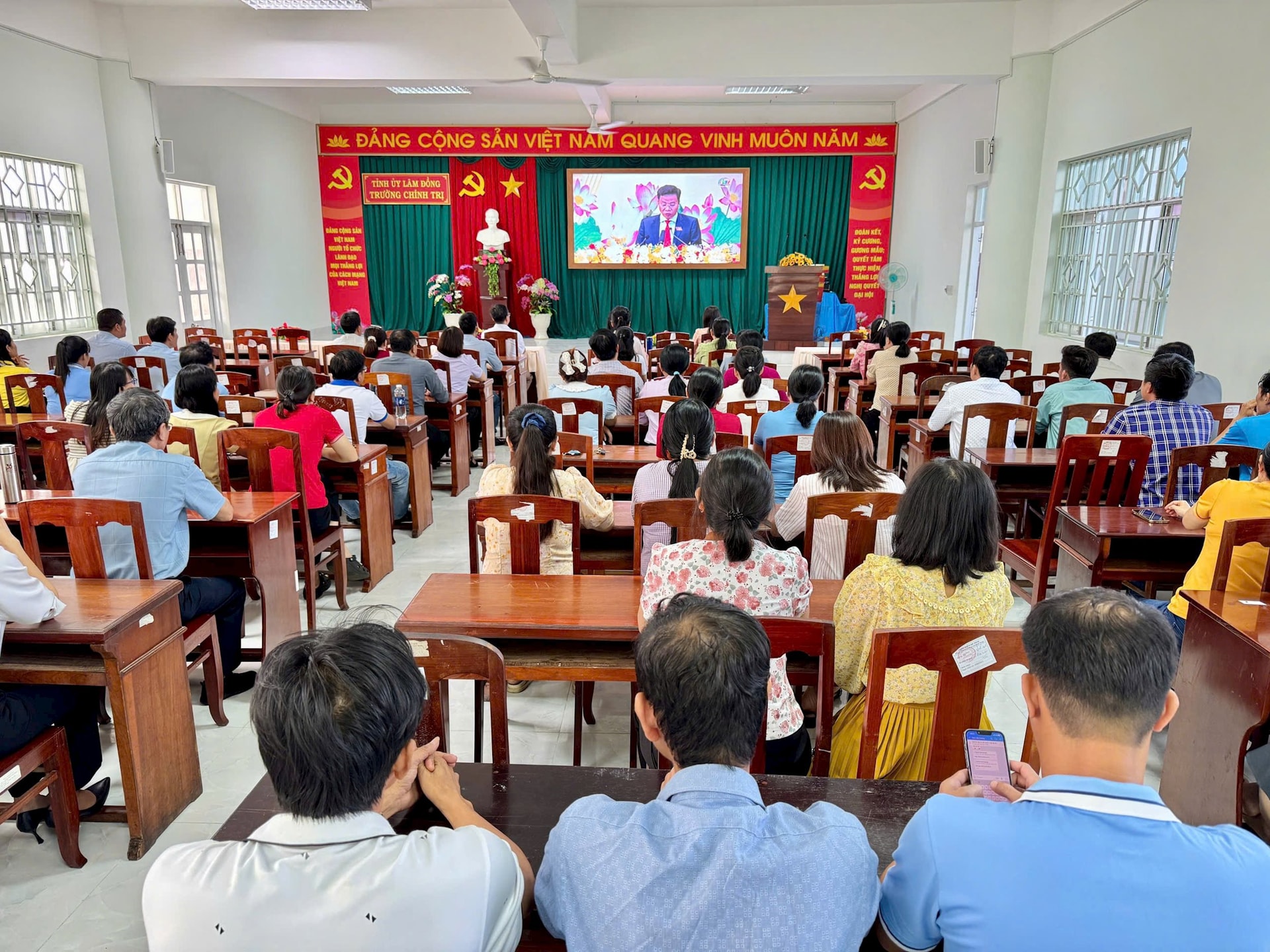 Cán bộ, giáo viên và học viên lớp K18 Trường Chính trị tỉnh Lâm Đồng (Cơ sở Phan Thiết) theo dõi trực tiếp phiên khai mạc Đại hội qua sóng truyền hình