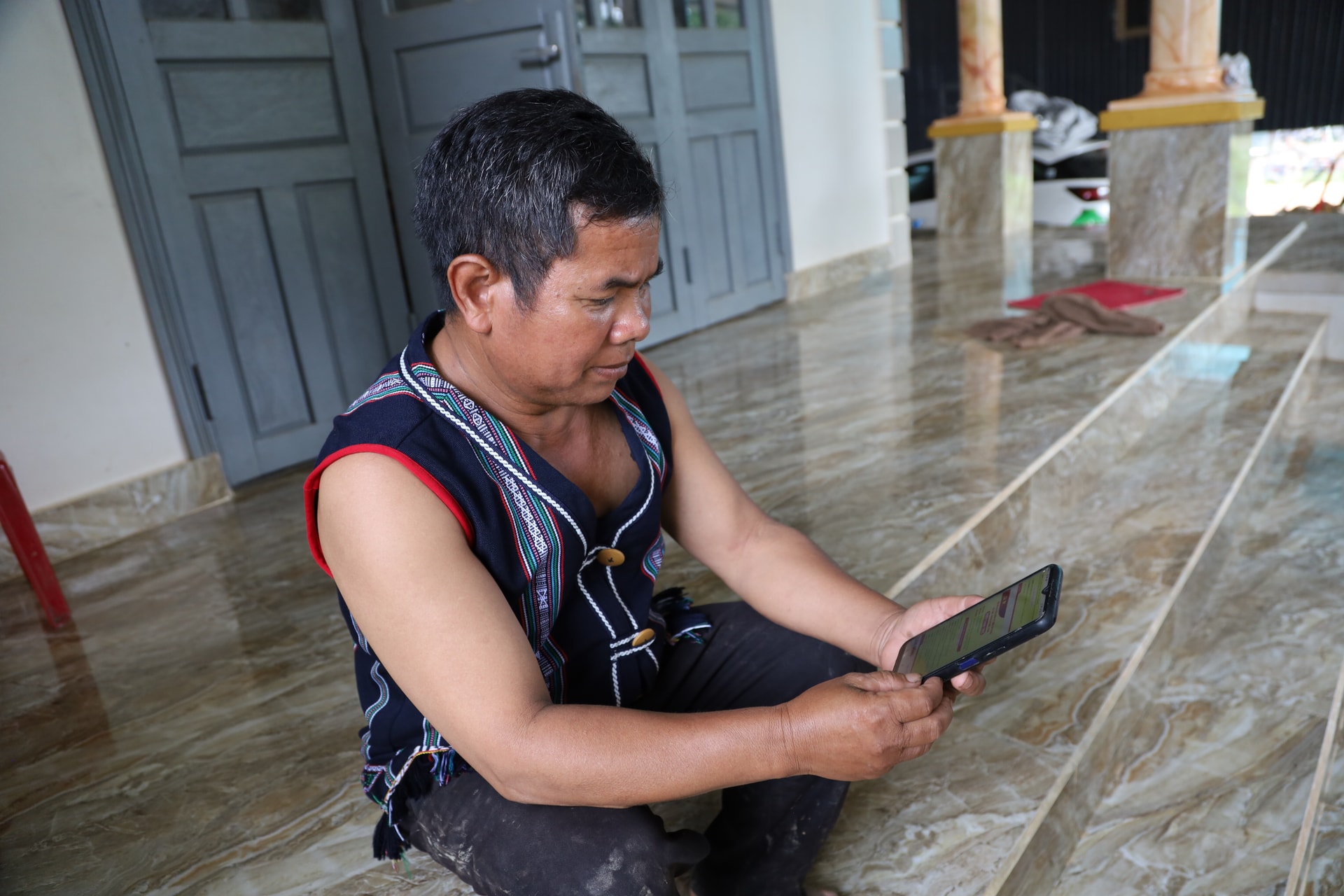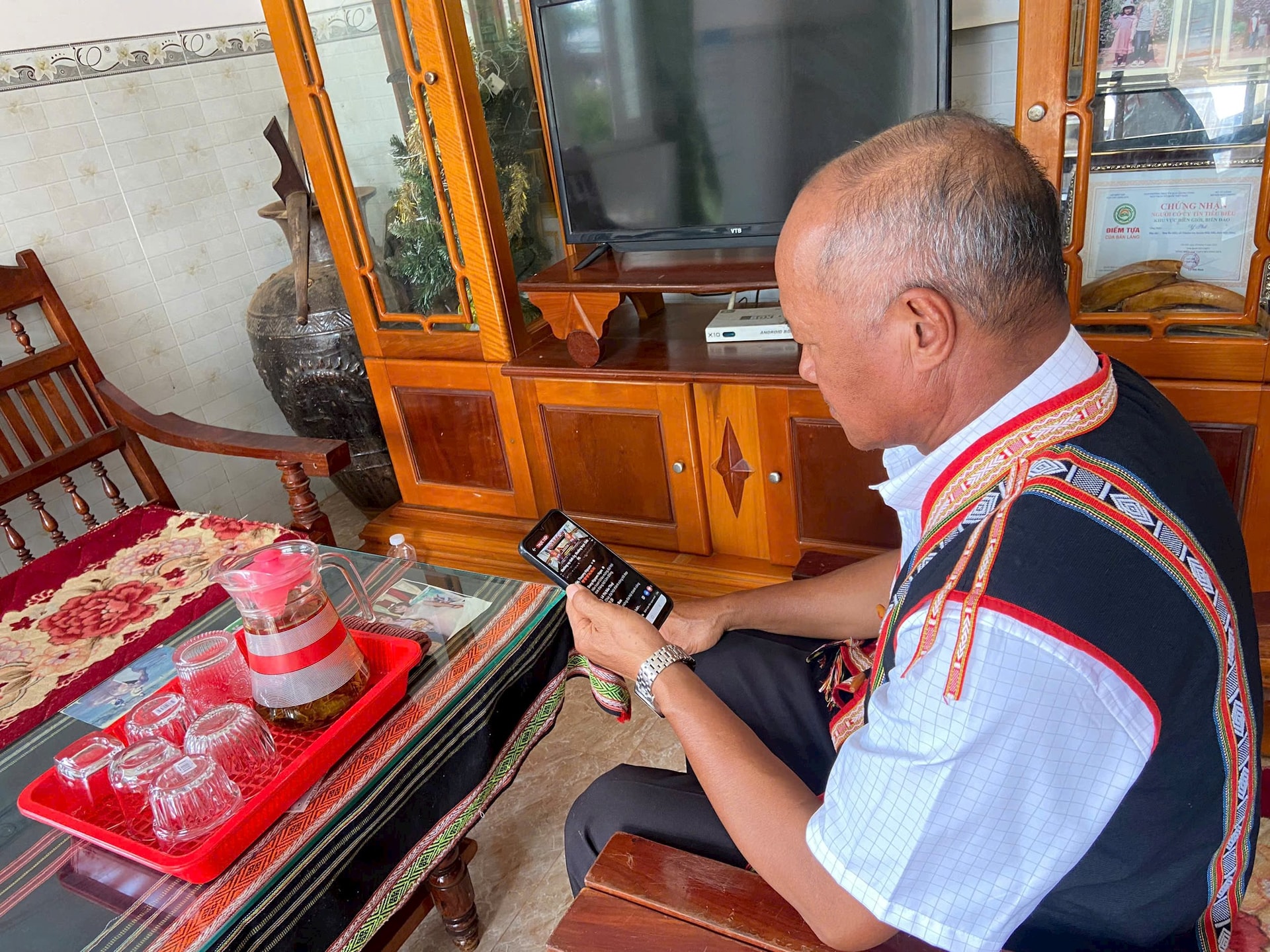 Già làng Cil Ha Kròng, xã Đam Rông 2 theo dõi các nội dung, chương trình Đại hội trên Báo và Phát thanh, truyền hình Lâm Đồng