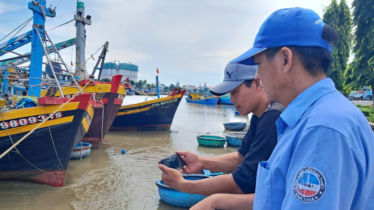 Ngư dân phường Phan Thiết, tỉnh Lâm Đồng tranh thủ trước giờ ra khơi theo dõi phiên khai mạc Đại hội Đảng bộ tỉnh lần thứ I