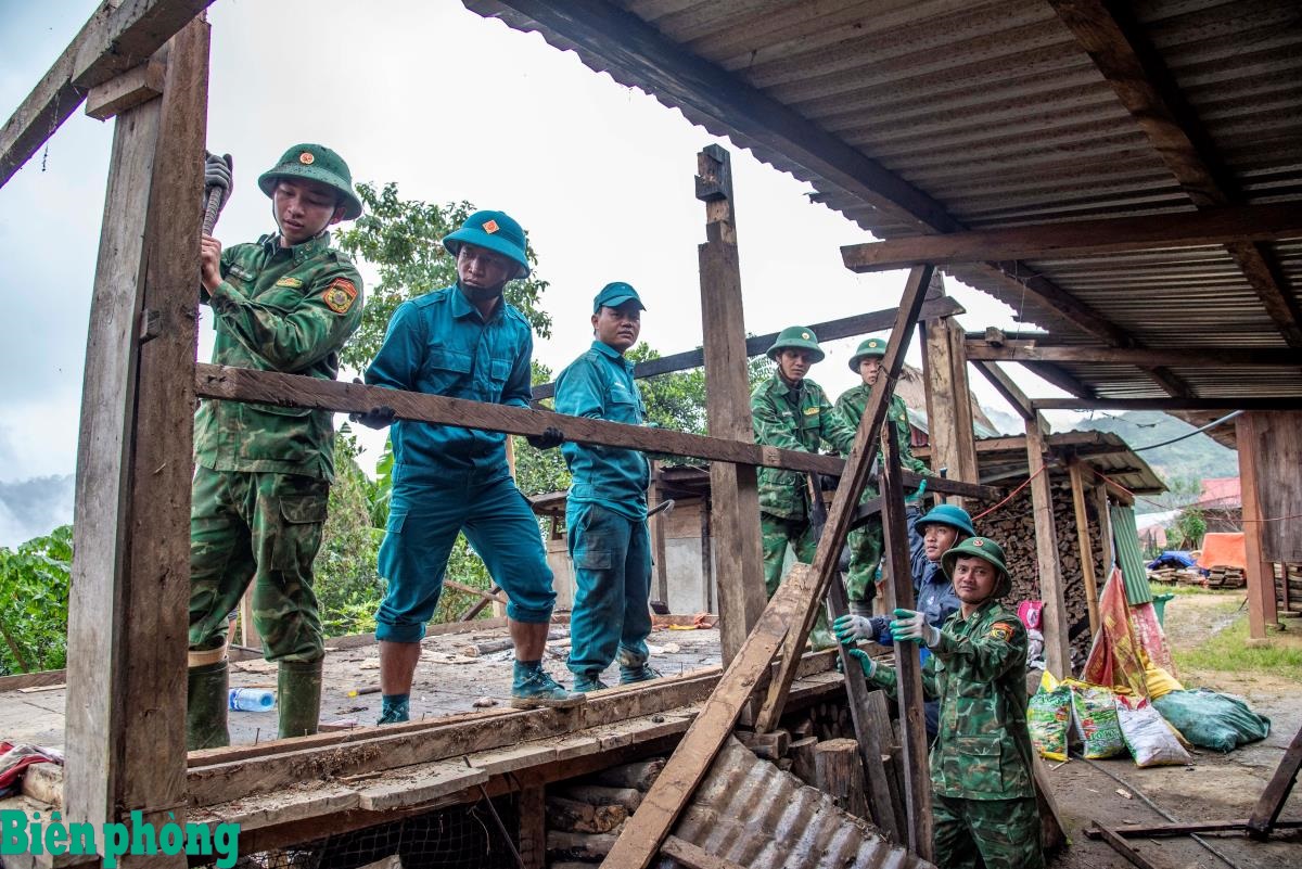Cán bộ, chiến sĩ Đồn Biên phòng Ga Ri và Đồn Biên phòng Tr’hy hỗ trợ người dân tháo dỡ nhà để chuyển về khu dân cư mới. Ảnh: Lê Văn Chương