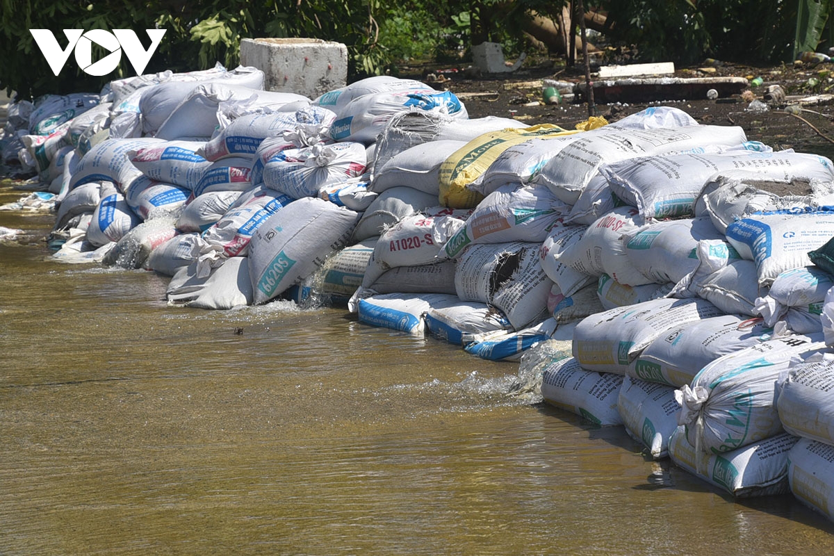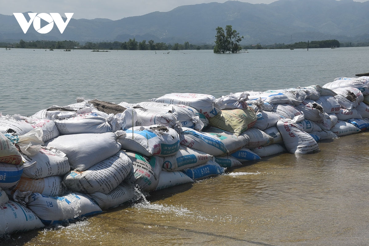 Lực lượng địa phương xếp bao tải cát ngăn nước dòng nước lũ tràn qua đê.