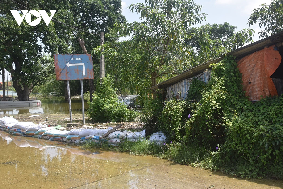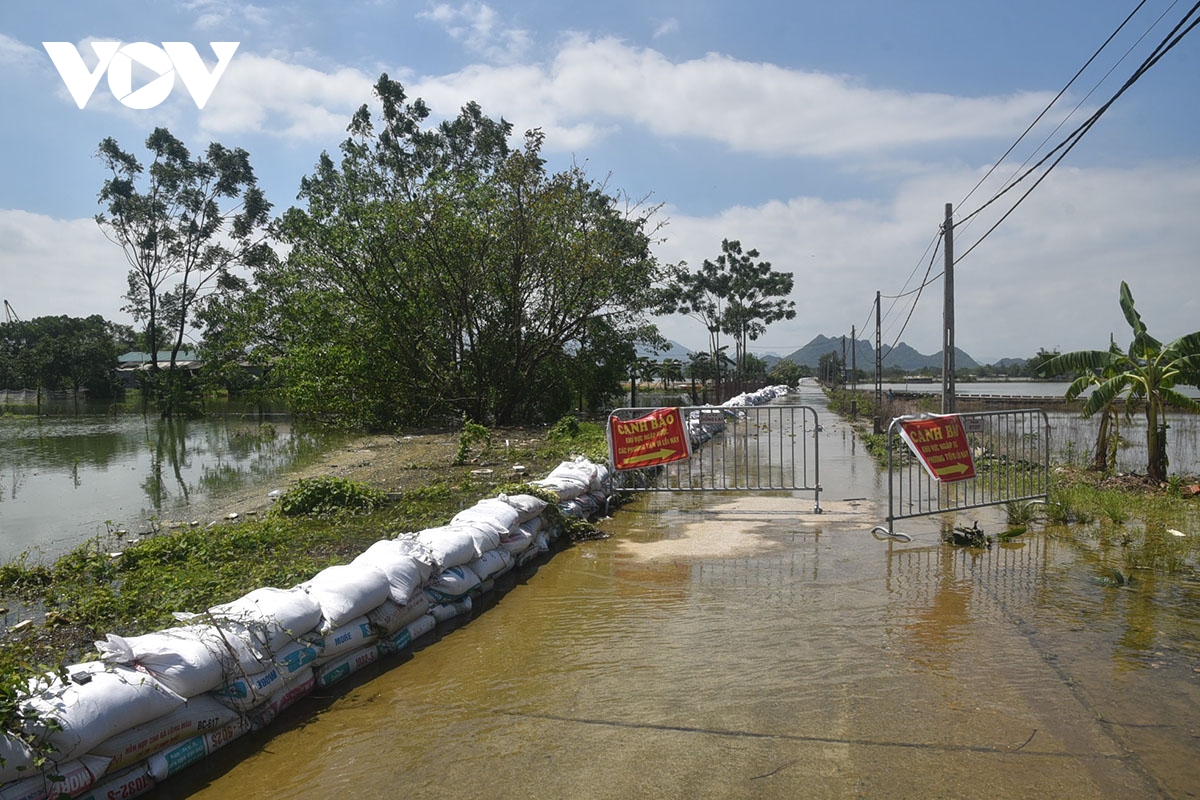 Trước tình hình nước tràn qua đê hữu Bùi để đảm bảo an toàn tính mạng, tài sản người dân chính quyền đã phải dựng hàng rào cảnh báo các phương tiện khu vực ngập nước.
