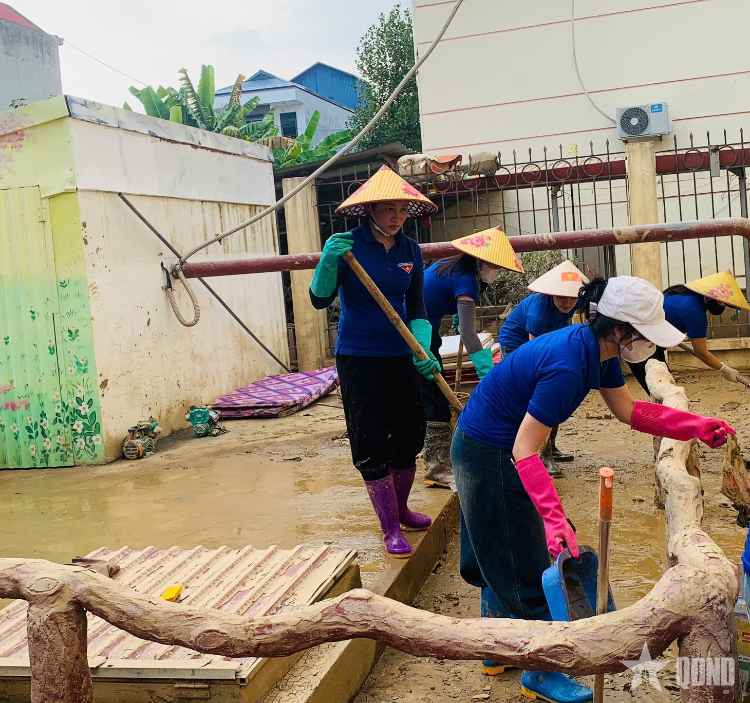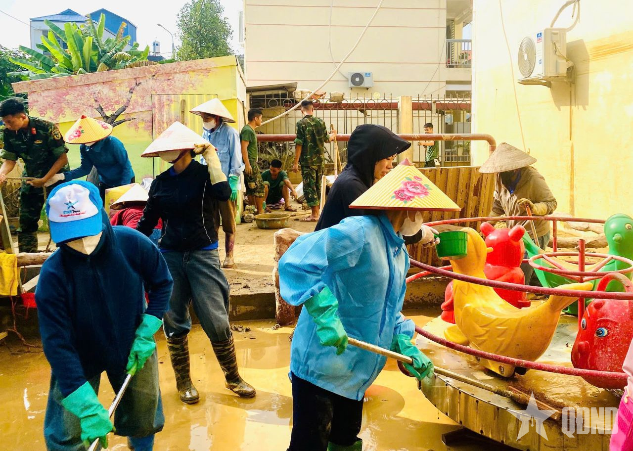 Giáo viên Trường mầm non Sơn Ca cùng bộ đội Lữ đoàn Pháo binh 382 (Quân khu 1) dọn dẹp bùn đất tại Trường mầm non Túc Duyên chiều 11-10.