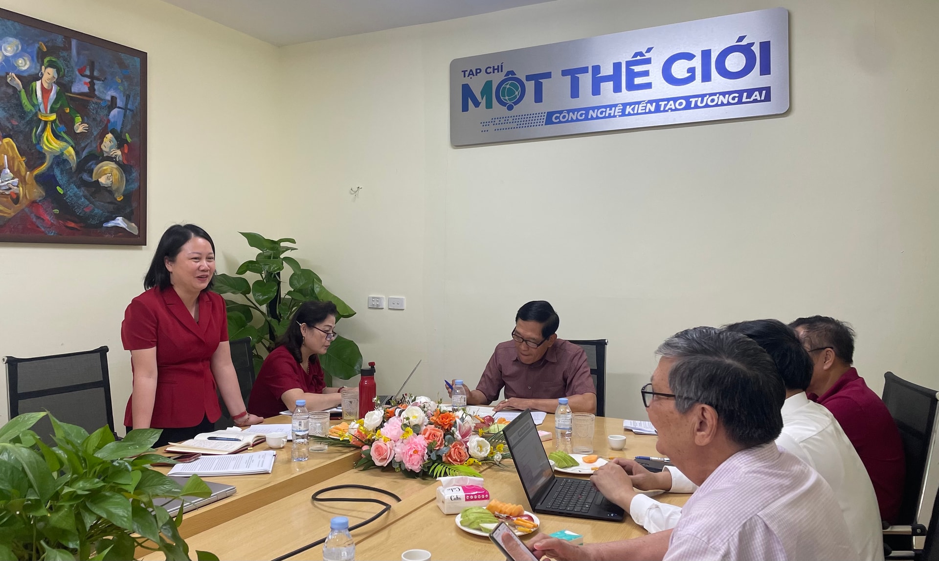 Nhà báo Lưu Quang Định – Tổng thư ký VASTI, Tổng Biên tập Tạp chí Một Thế Giới (bìa phải) báo cáo chuyên đề sinh hoạt chi bộ - Ảnh: Minh Đức