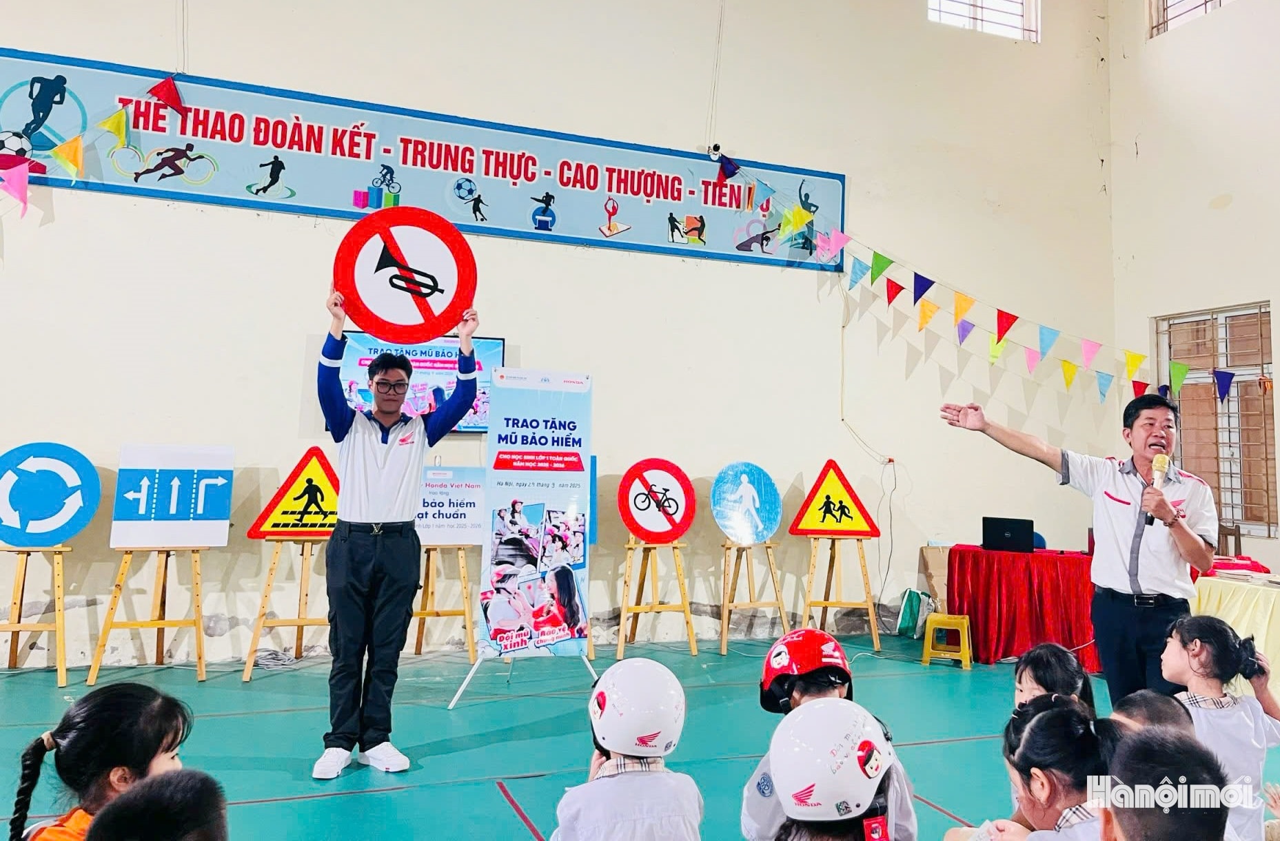 Học sinh Trường Tiểu học Kiến Hưng tham gia buổi tuyên truyền kỹ năng tham gia giao thông an toàn, được hướng dẫn cách quan sát, chấp hành tín hiệu và đội mũ bảo hiểm đúng quy định khi di chuyển. Ảnh: KH