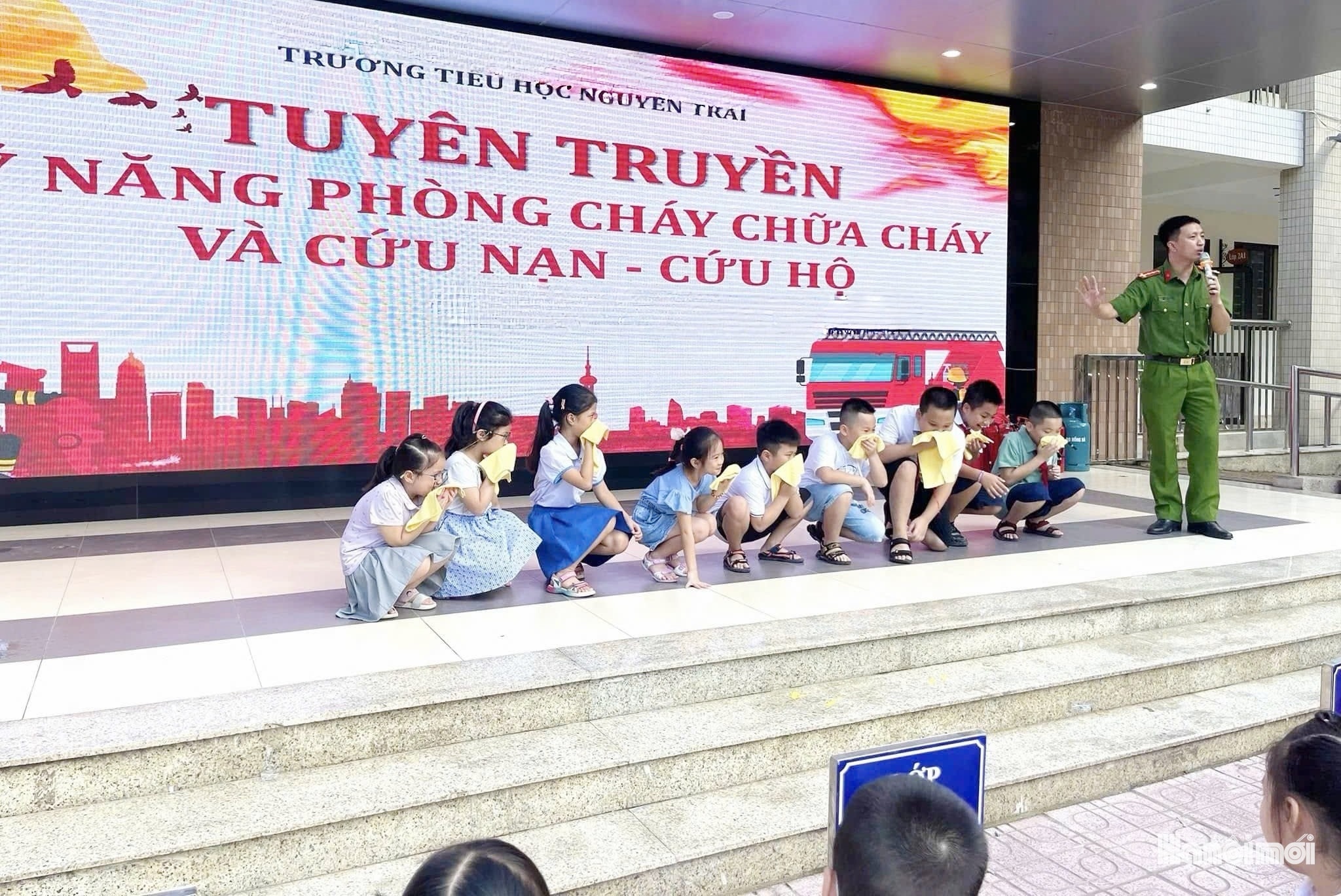 Trường Tiểu học Nguyễn Trãi tổ chức hướng dẫn học sinh kỹ năng thoát hiểm khi xảy ra hỏa hoạn, giúp các em nắm vững cách xử lý tình huống và di chuyển an toàn. Ảnh: NT