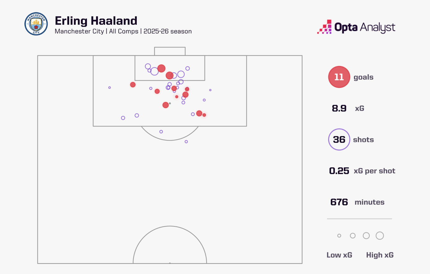 Haaland đã ghi 11 bàn trên mọi đấu trường mùa này, là nhân tố tâm điểm của trận đêm nay. Ảnh: Opta.