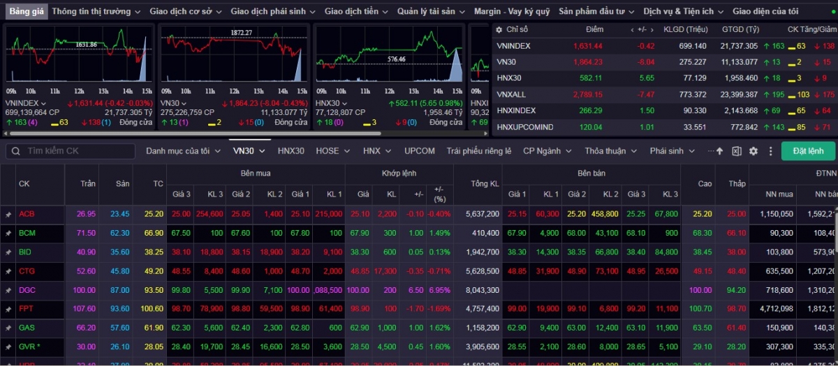Phiên giao dịch ngày 13/11, VN-Index chủ yếu rung lắc quanh tham chiếu trước khi đóng cửa quanh mức 1.631,44 điểm (-0,03%). Sàn HOSE chứng kiến 163 mã tăng và 138 mã giảm. VNM (+3,3%), GEE (tăng trần) và DGC (tăng trần) tác động tích cực nhất tới điểm số thị trường.