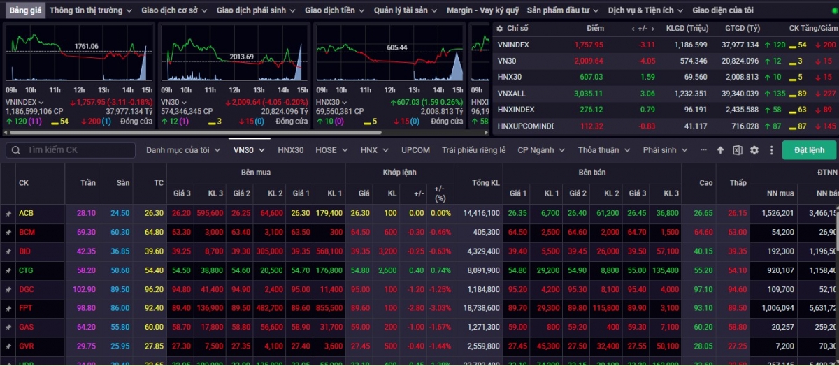 Sau phiên VN-Index chịu áp lực bán ở vùng giá 1.800 điểm, ngắt mạch 4 phiên tăng điểm liên tiếp sau khi vượt lên vùng giá 1.700 điểm. Đầu phiên 15/10 thị trường phục hồi, VN-Index tăng lên 1.774 điểm và tiếp tục chịu áp lực điều chỉnh trong phiên với mức độ phân hóa tích cực hơn phiên trước. Kết phiên giao dịch ngày 15/10, VN-Index giảm 3,11 điểm (-0,18%) về mức 1.757,95 điểm. Trong khi VN30 giảm 4,05 điểm (-0,20%) về mức 2.009,64 điểm, trên mốc tâm lý 2.000 điểm.