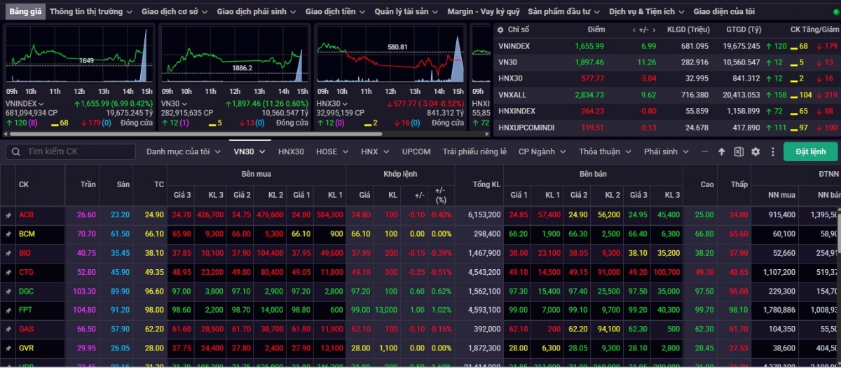 Phân hóa là diễn biến chính của các lĩnh vực Ngân hàng, Chứng khoán và Bất động sản. Một số cổ phiếu ghi nhận hiệu suất ấn tượng trong phiên gồm có GEX (+1,9%), KBC (+2,3%), DGW (+2,1%),…