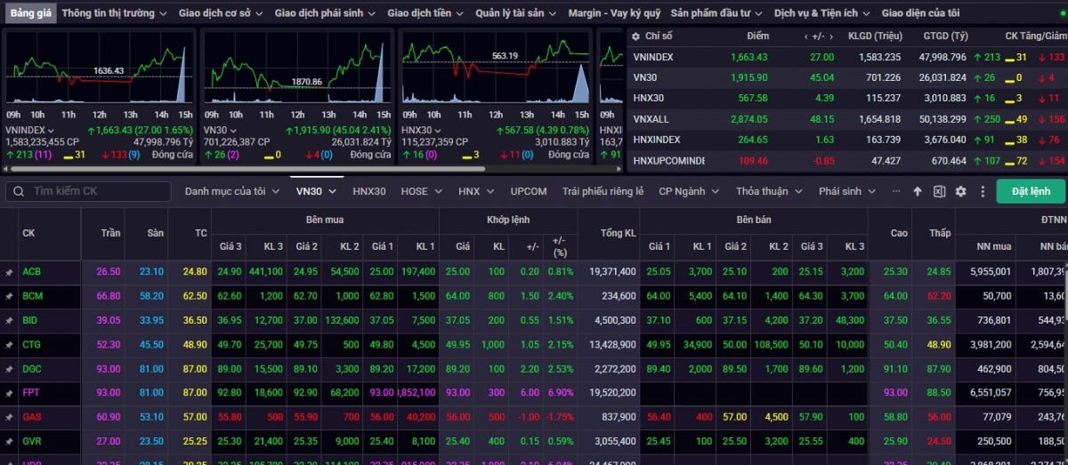 Kết phiên giao dịch ngày 21/10, VN-Index tăng 27 điểm, tương đương 1,65% lên mốc 1.663,43 điểm