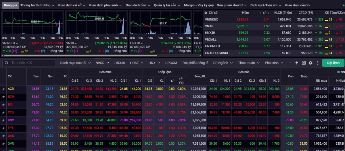 Ở chiều ngược lại, ngày hân hoan của các cổ đông nhóm ngành Bất động sản và Phân bón khi “vững tay chèo” trước sức nén của phe bán và kết phiên với sắc tím xuất hiện rải rác ở nhiều cổ phiếu như HDC, DIG, DCM… Sắc xanh bao trùm thị trường khi số mã tăng điểm (238 mã) áp đảo so với số mã giảm điểm (92 mã) và thanh khoản khớp lệnh ở mức tương đương so với bình quân 20 phiên. Chốt phiên giao dịch ngày 22/1, VN-Index đóng cửa ở mức 1.882,73, giảm 2,71 điểm (-0,14%).