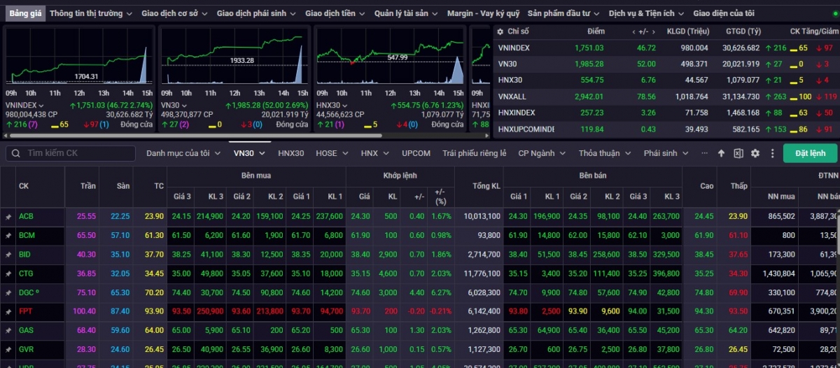 Chốt phiên giao dịch ngày 22/12, VN-Index đóng cửa ở mức 1.751,03, tăng 46,72 điểm