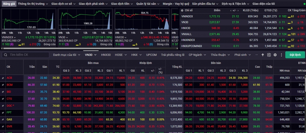 Thị trường chiều 23/12 có diễn biến tương đối tích cực về điểm số, khi chỉ số VN-Index duy trì mức tăng hơn 20 điểm ở phần lớn thời gian giao dịch, và đóng cửa tăng hơn 21 điểm, mức cao hơn mức trung bình trong ngày. Trong đó, đà tăng được hỗ trợ bởi các yếu tố: lực cầu duy trì ổn định, tập trung chủ yếu vào nhóm cổ phiếu họ Vingroup (VIC +7,0%, VHM +7,0%, VPL +5,1%, VRE +3,8%); khối ngoại mua ròng gần 721 tỷ đồng, tập trung chủ yếu vào MWG (+235 tỷ), MBB (+103 tỷ), VIX (+99 tỷ), và HPG (+79 tỷ).