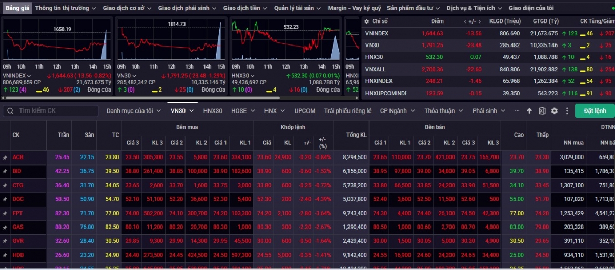 Chốt phiên giao dịch ngày 26/3, VN-Index đóng cửa ở mức 1.644,63 điểm, giảm 13,56 điểm