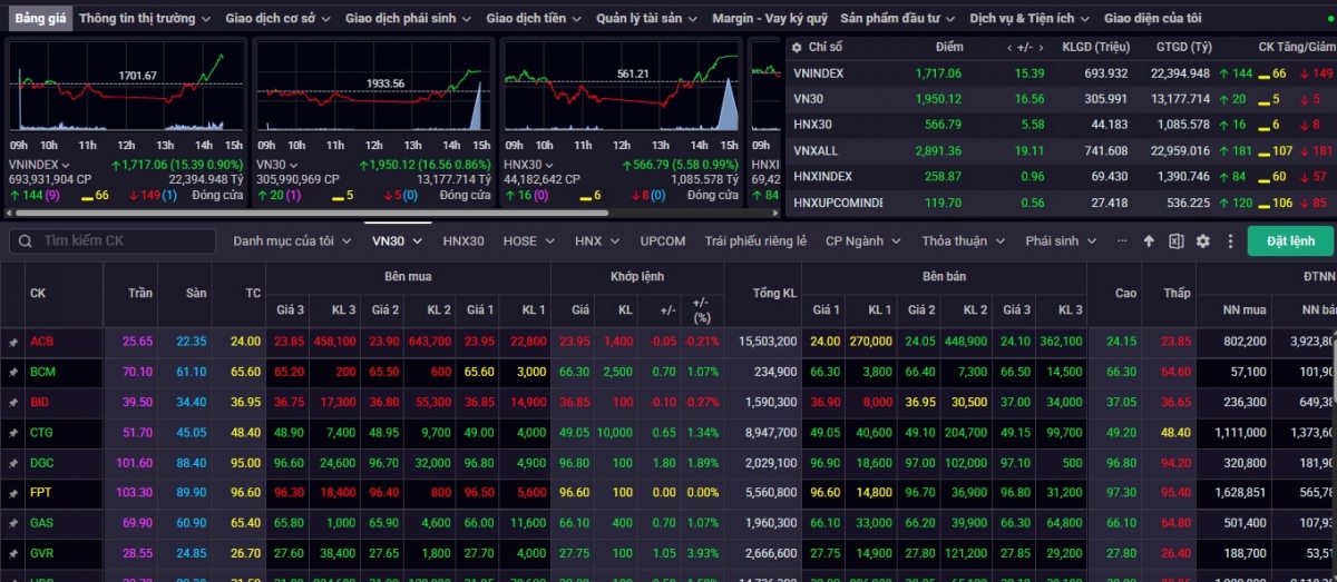 Sau khoảng thời gian rung lắc, VN-Index tăng tốc trong phiên chiều 2/12 và đóng cửa quanh mức 1.717,06 điểm (+0,9%). Sàn HOSE chứng kiến 144 mã tăng và 149 mã giảm. Các cổ phiếu VIC (+1,9%), VJC (+6,9%), TCB (+3%) đóng góp nhiều nhất cho số điểm tăng của VN-Index.