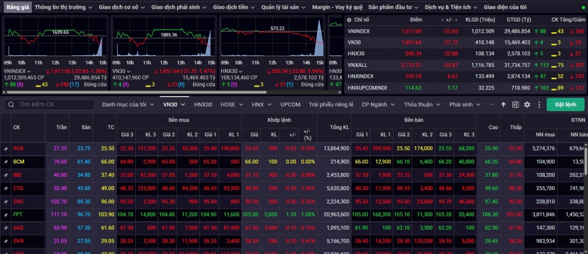 Chốt phiên giao dịch ngày 3/11, VN-Index đóng cửa ở mức 1.617,00, giảm 22,65 điểm