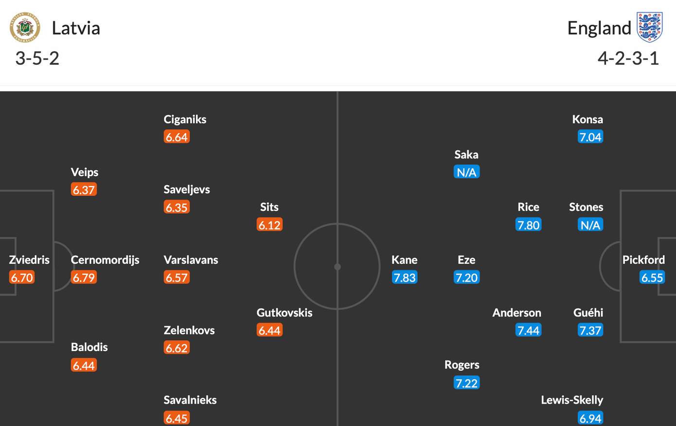 Đội hình dự kiến Latvia vs Anh.