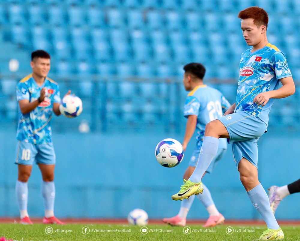 Hoàng Đức và đồng đội tích cực tập luyện chuẩn bị cho 2 trận đấu liên tiếp với Nepal (Ảnh: VFF)