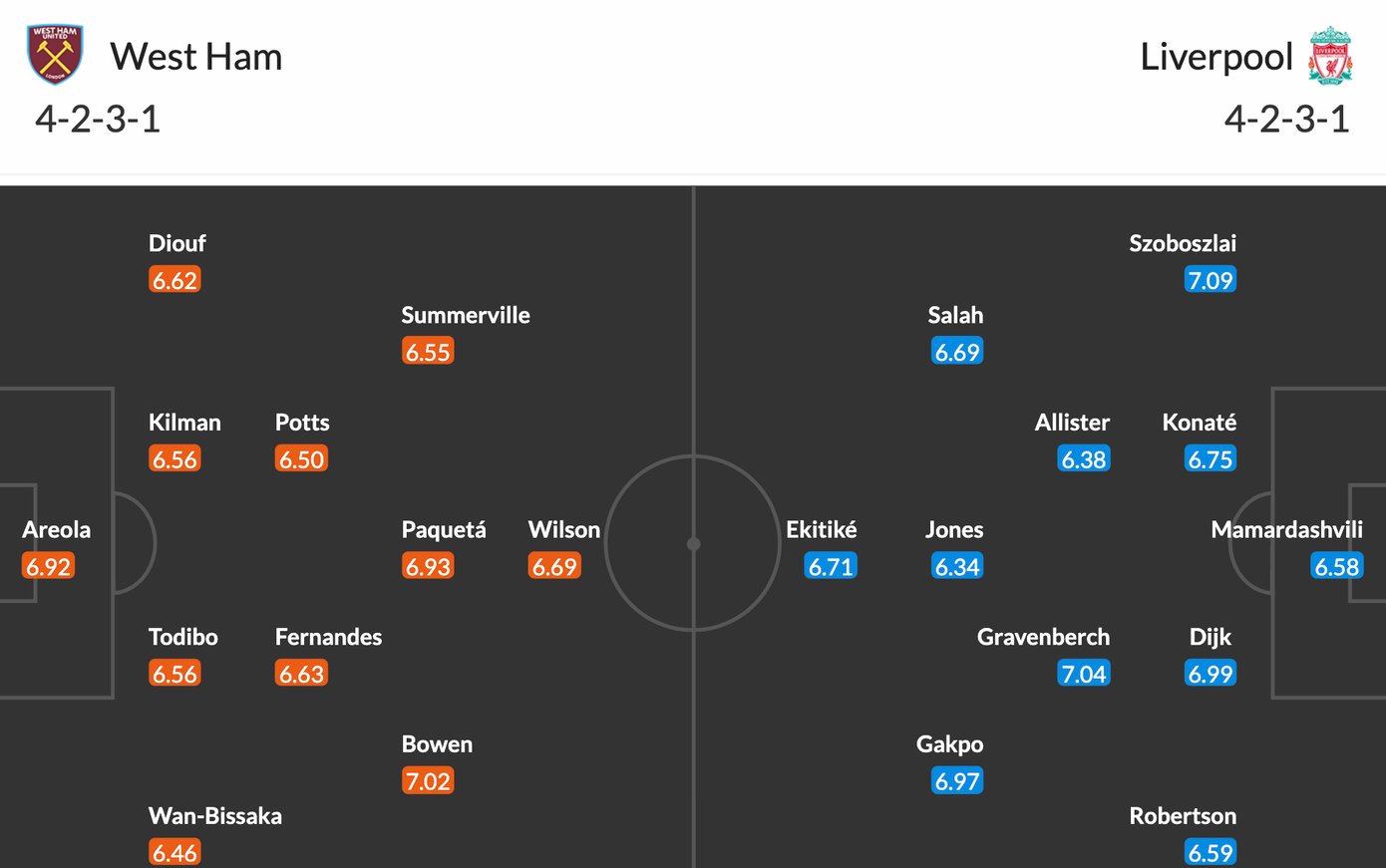 Liverpool đã thua liên tiếp 2 trận trước Man City và Nottingham Forest ở Ngoại hạng Anh. Trận thua Man City là màn trình diễn bạc nhược của "The Kop". Đến thất bại trước Nottingham trên sân nhà là sự thất vọng tột cùng của Liverpool. Trong những đối thủ mà Liverpool sẩy chân gần đây, trận gặp West Ham trên lý thuyết dễ thở nhất cho đoàn quân của HLV Slot.