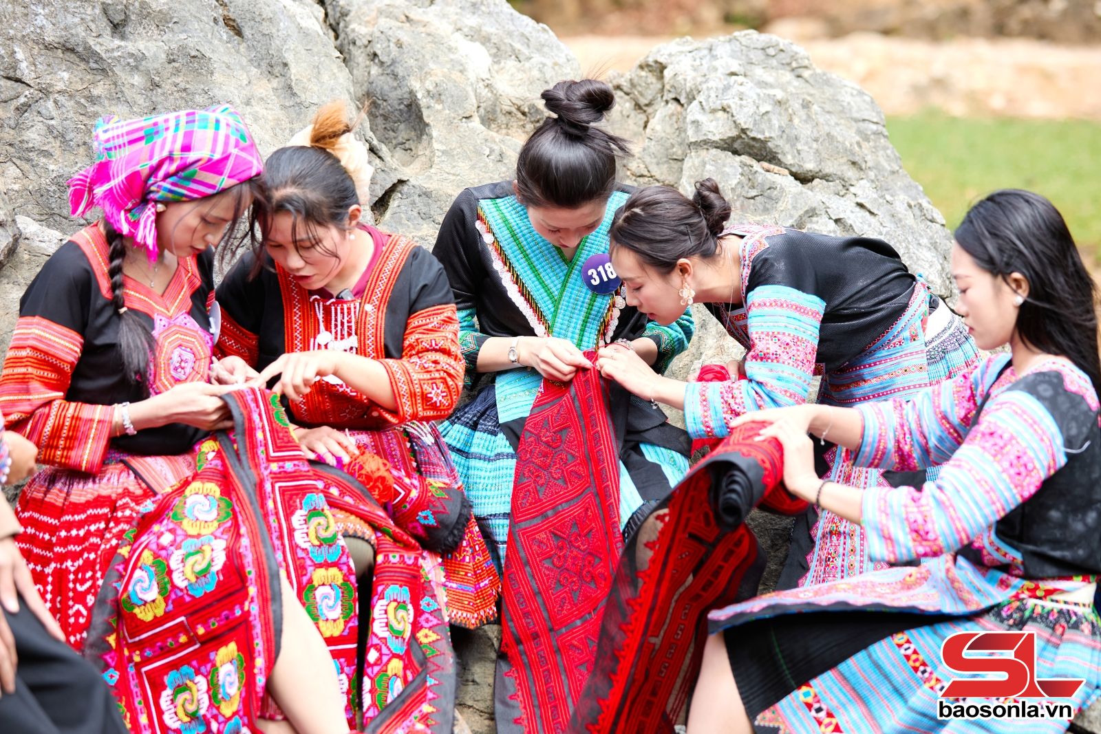 Các thí sinh trải nghiệm thêu hoa văn dân tộc Mông. Ảnh BTC