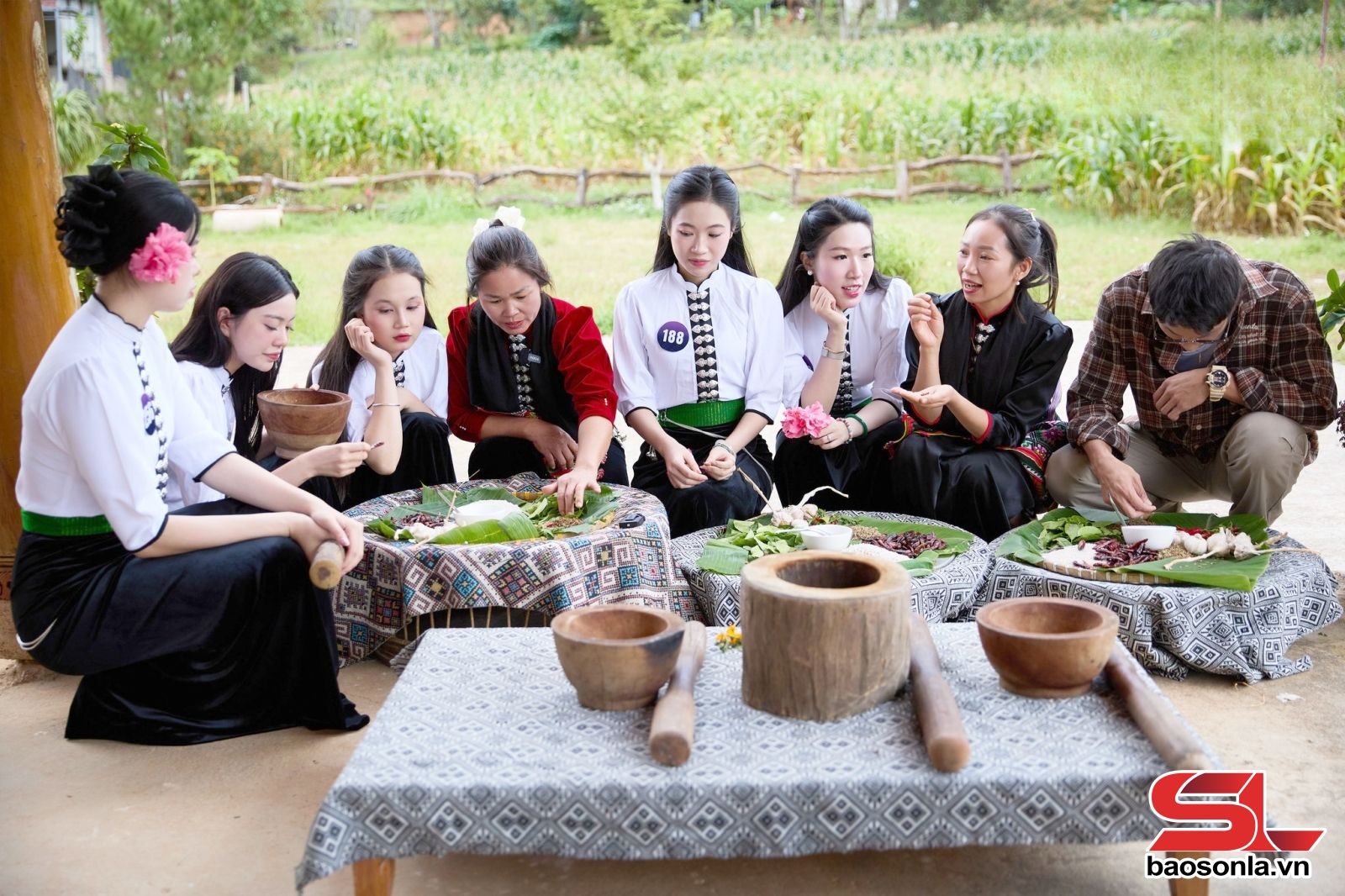 Thí sinh với hoạt động trải nghiệm văn hóa dân tộc Thái tại tổ dân phố Vặt Hồng, phường Mộc Châu.Ảnh BTC