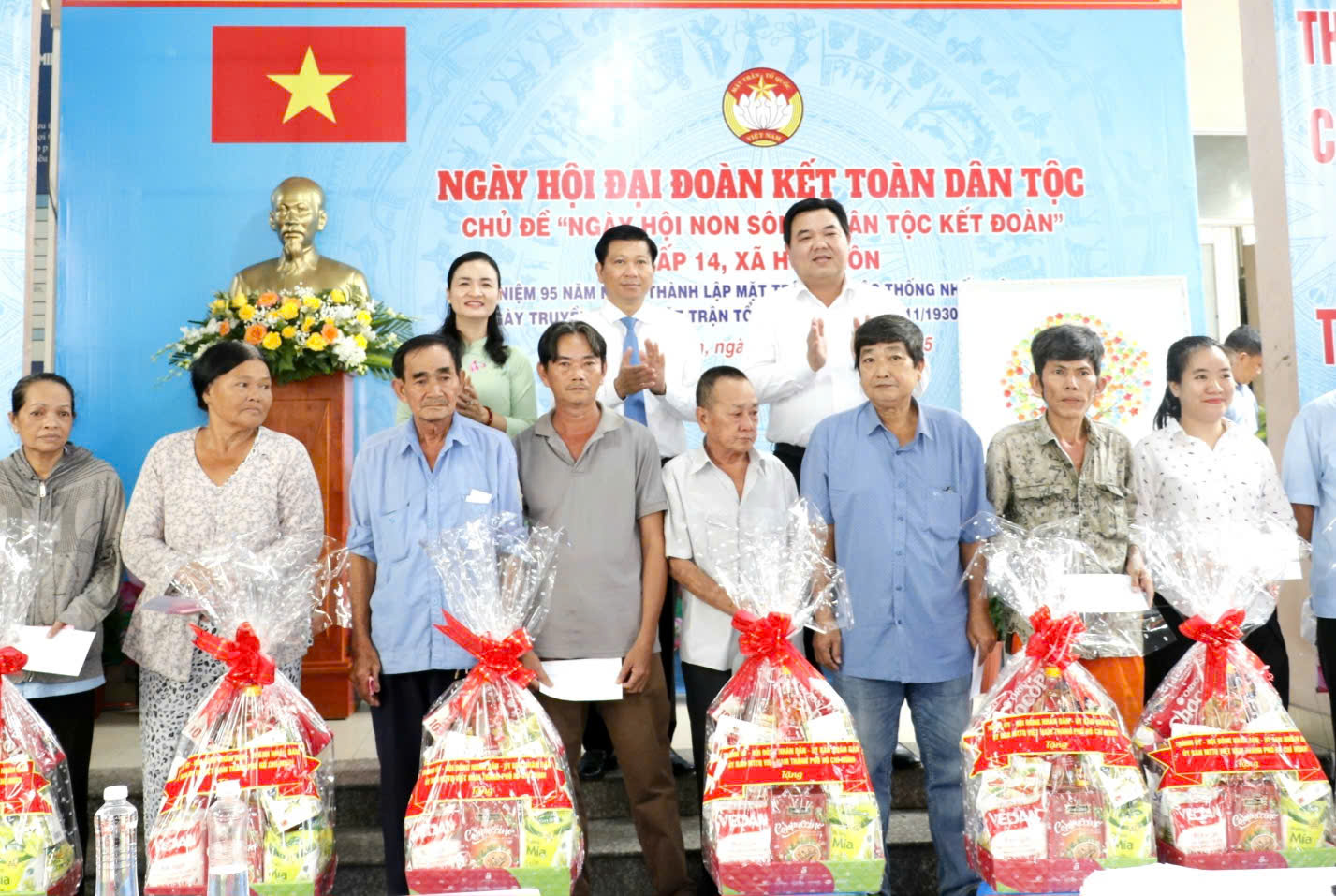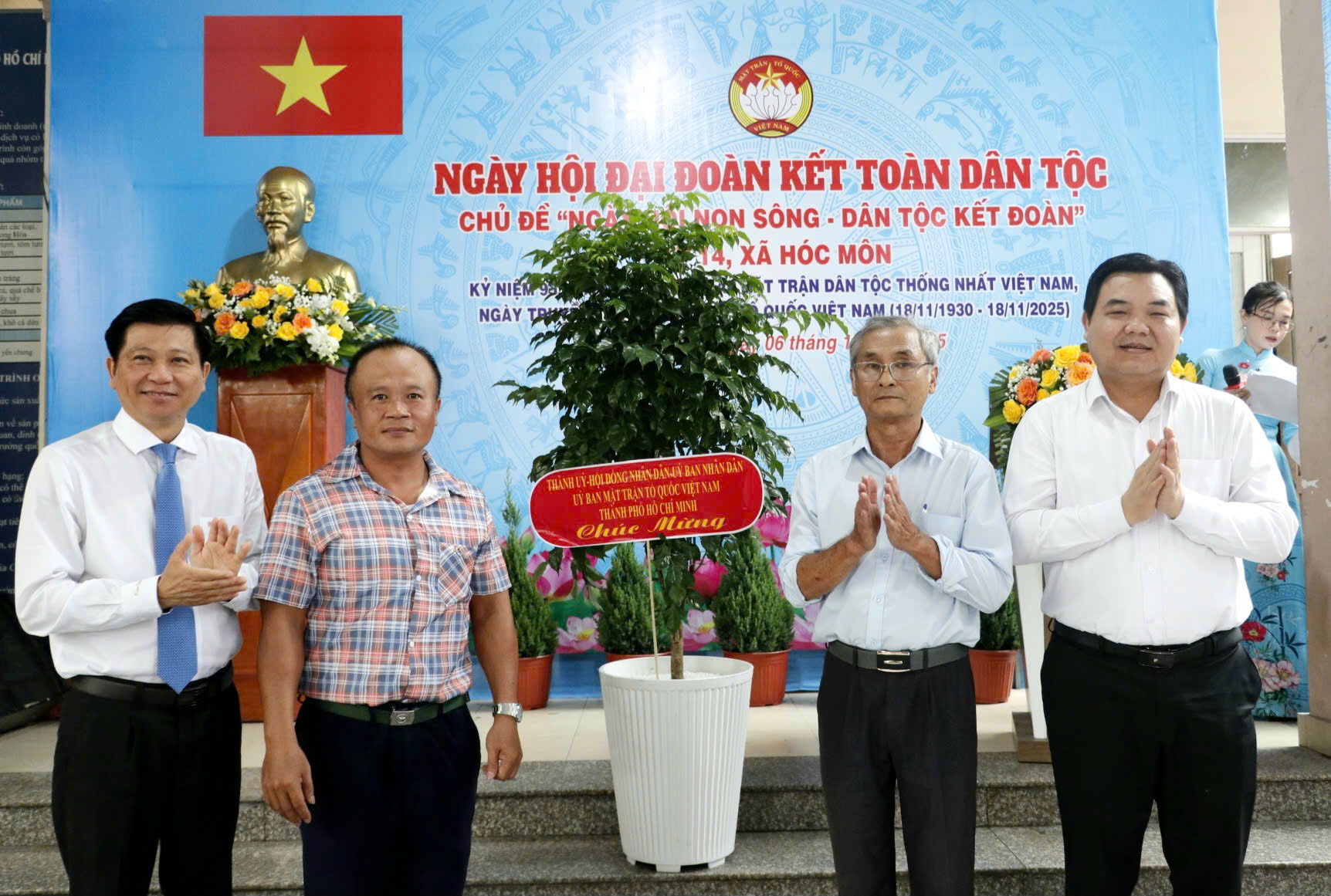 Đồng chí Trần Văn Tuấn cùng đại biểu trao cây xanh của Thành ủy - HĐND - UBND - Ủy ban MTTQ Việt Nam TPHCM chúc mừng ngày hội