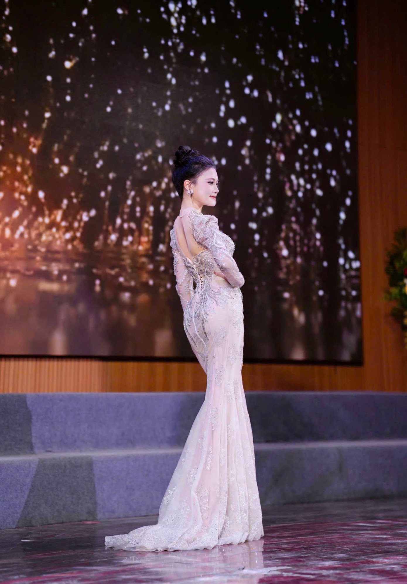 Đặc biệt, trong phần thi dạ hội, Phương Anh thực sự bùng nổ khi xuất hiện trong bộ váy dạ hội đuôi cá quyến rũ, làm chủ sân khấu bằng lối trình diễn uyển chuyển, cuốn hút. “Mỗi phần thi đều là kết quả của quá trình tập luyện nghiêm túc. Mình luôn biết ơn chị mentor - người đã đồng hành, chỉnh sửa từng chi tiết và giúp mình tự tin hơn trên sân khấu”, cô bày tỏ.