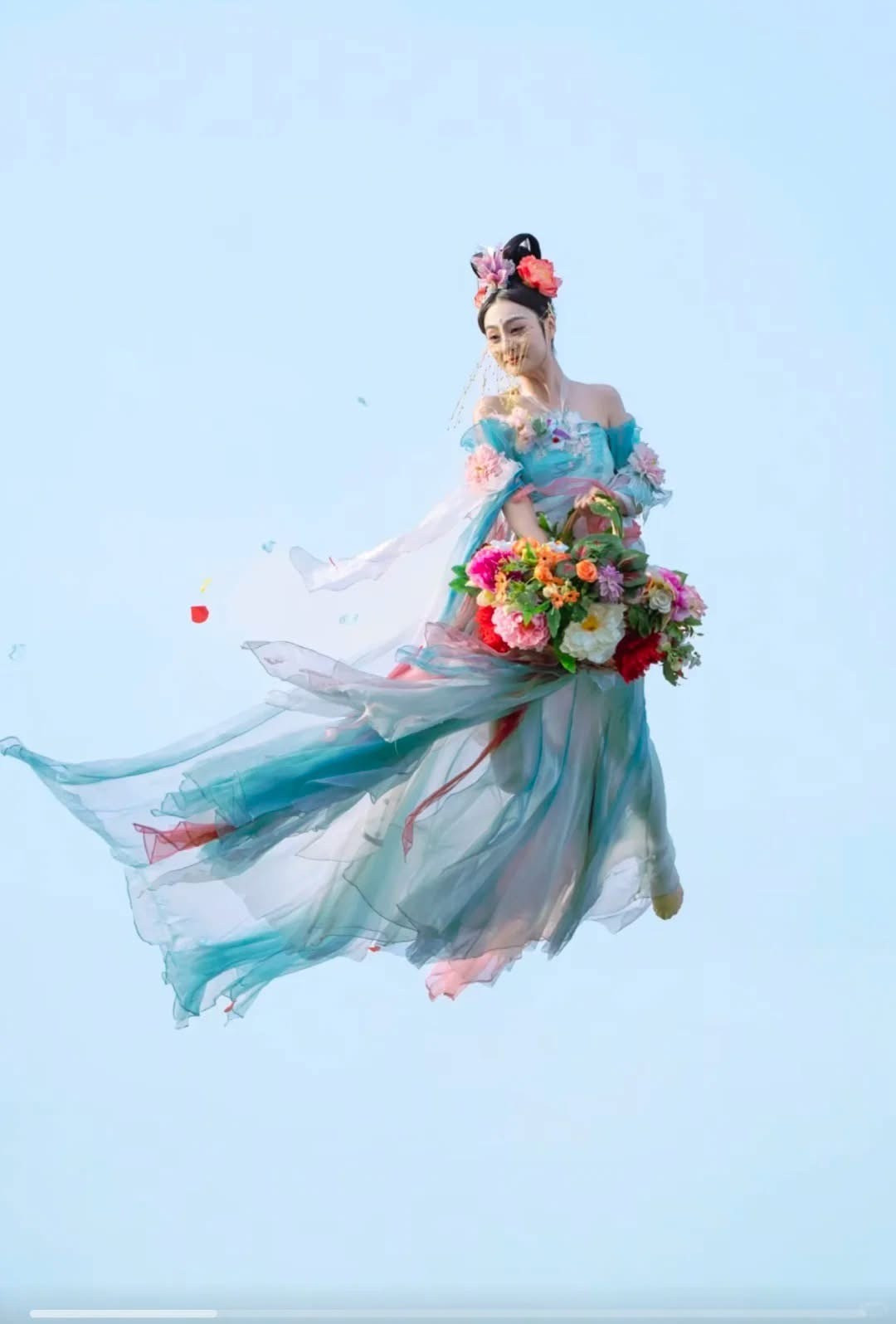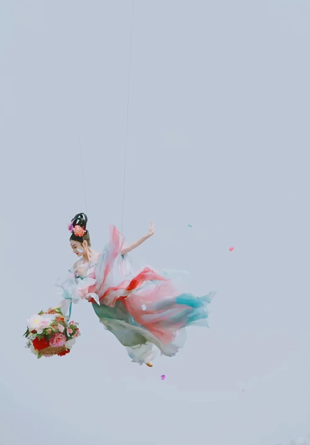 Trong các khoảnh khắc được ghi lại, cô gái hóa thân thành Hằng Nga mặc trang phục lụa mỏng bồng bềnh, một tay cầm giỏ hoa, một tay cầm những cánh hoa mẫu đơn đỏ thắm và uyển chuyển múa lượn giữa không trung.