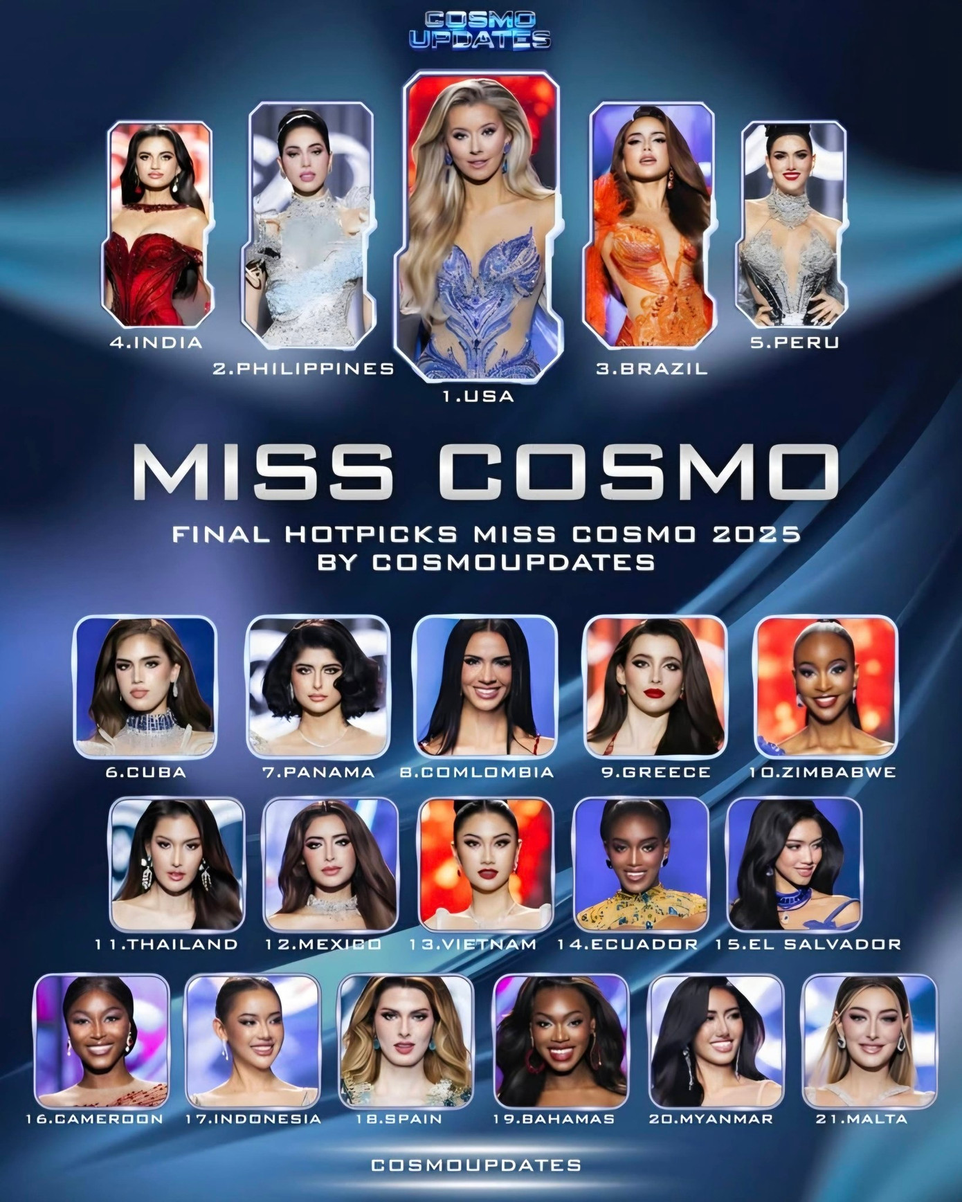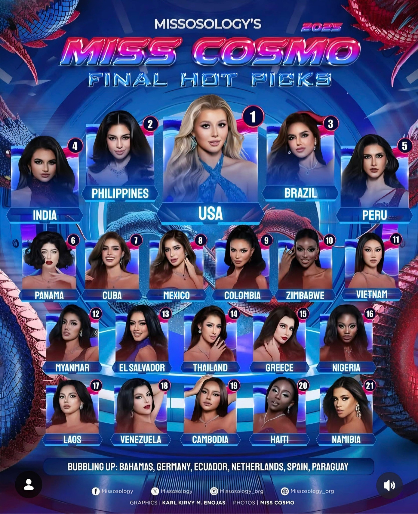 Trước thềm Chung kết Miss Cosmo 2025, rất nhiều chuyên trang nhan sắc quốc tế cũng như Việt Nam đều dự đoán người đẹp Mỹ Yolina Lindquist sẽ đăng quang mùa giải năm nay.