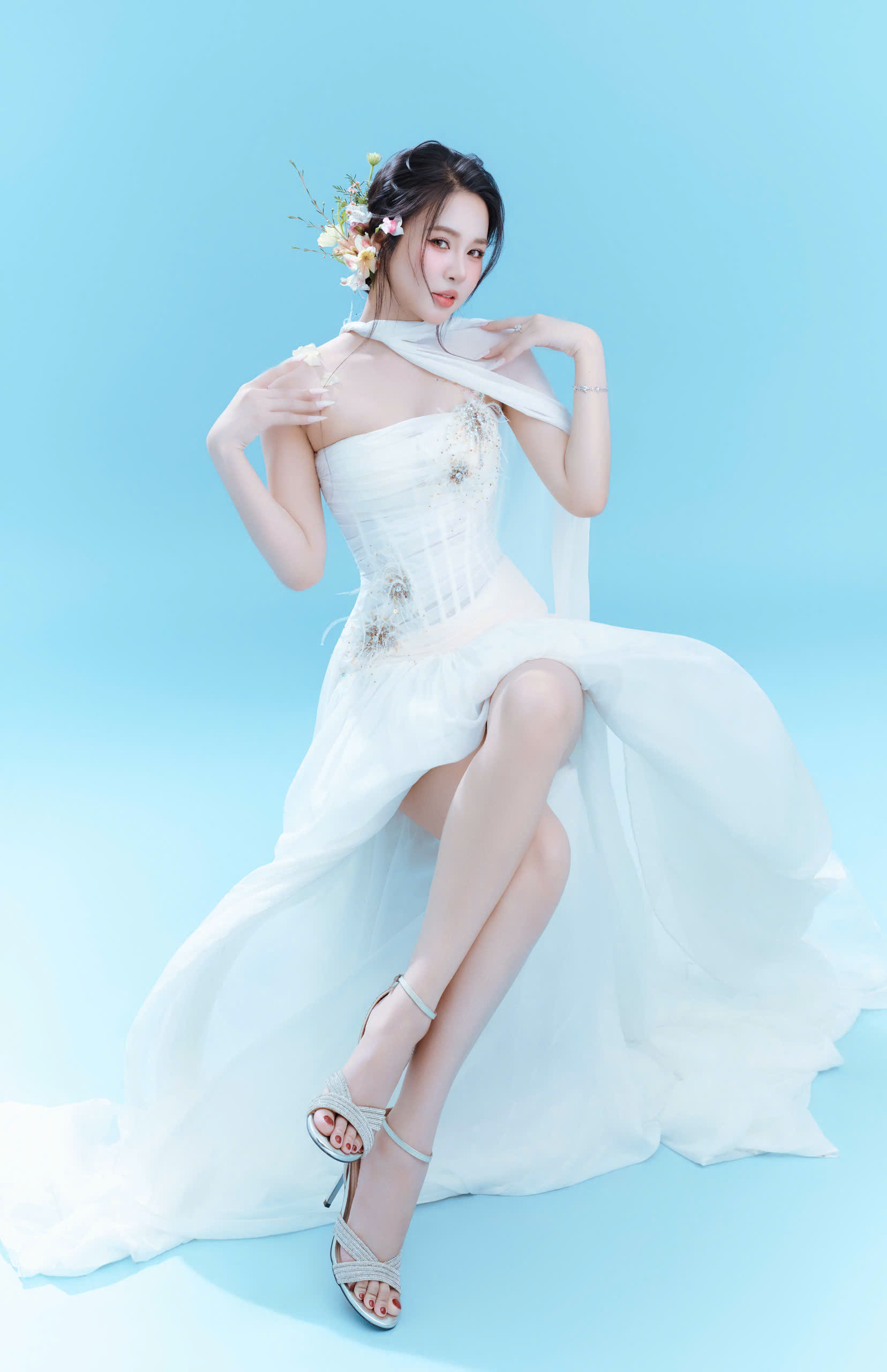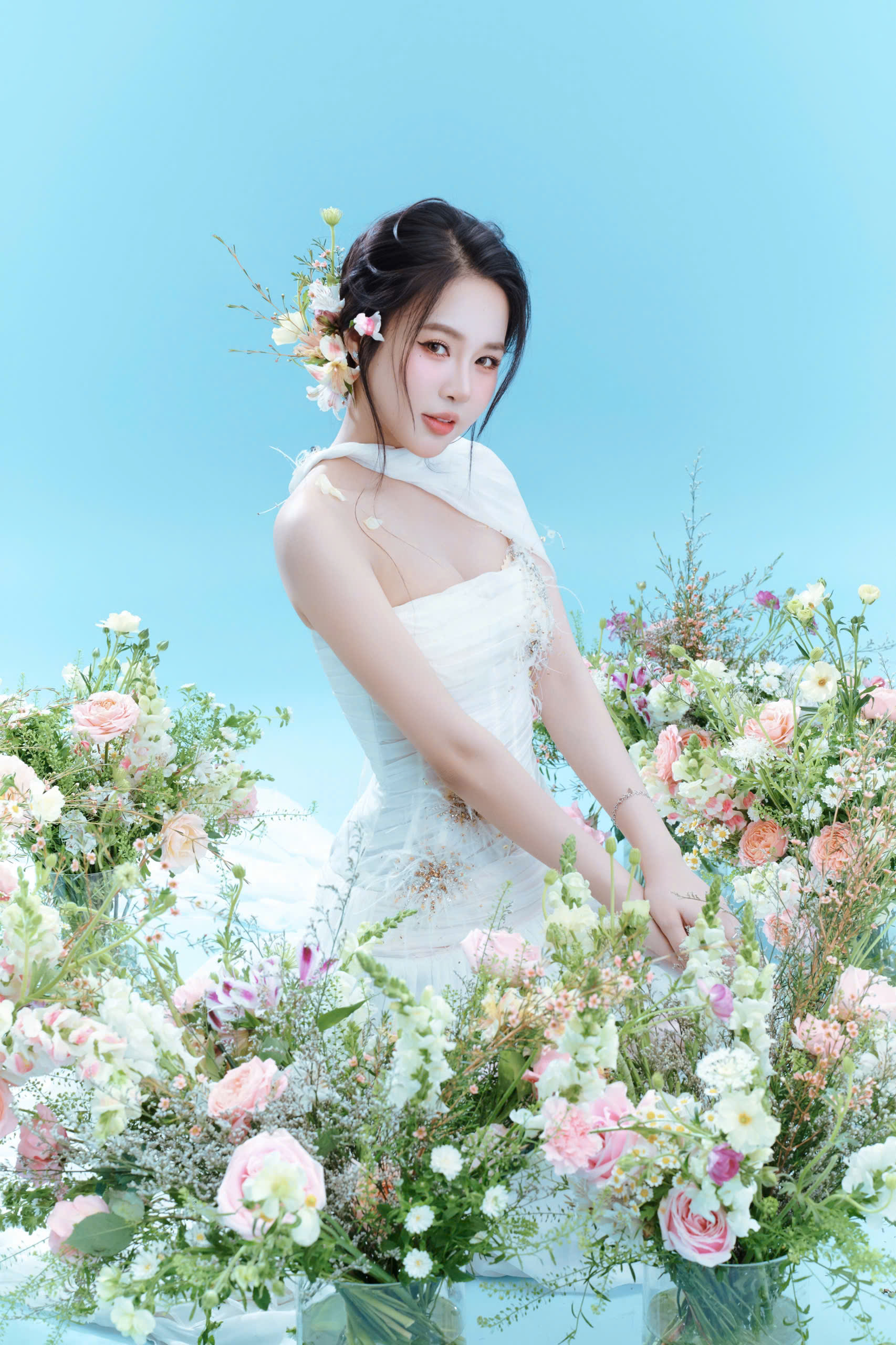 Trong loạt hình, nàng hậu diện những thiết kế váy trắng bồng bềnh, kết hợp cùng không gian được phủ đầy hoa tươi và tông màu pastel chủ đạo như hồng phấn, xanh baby.