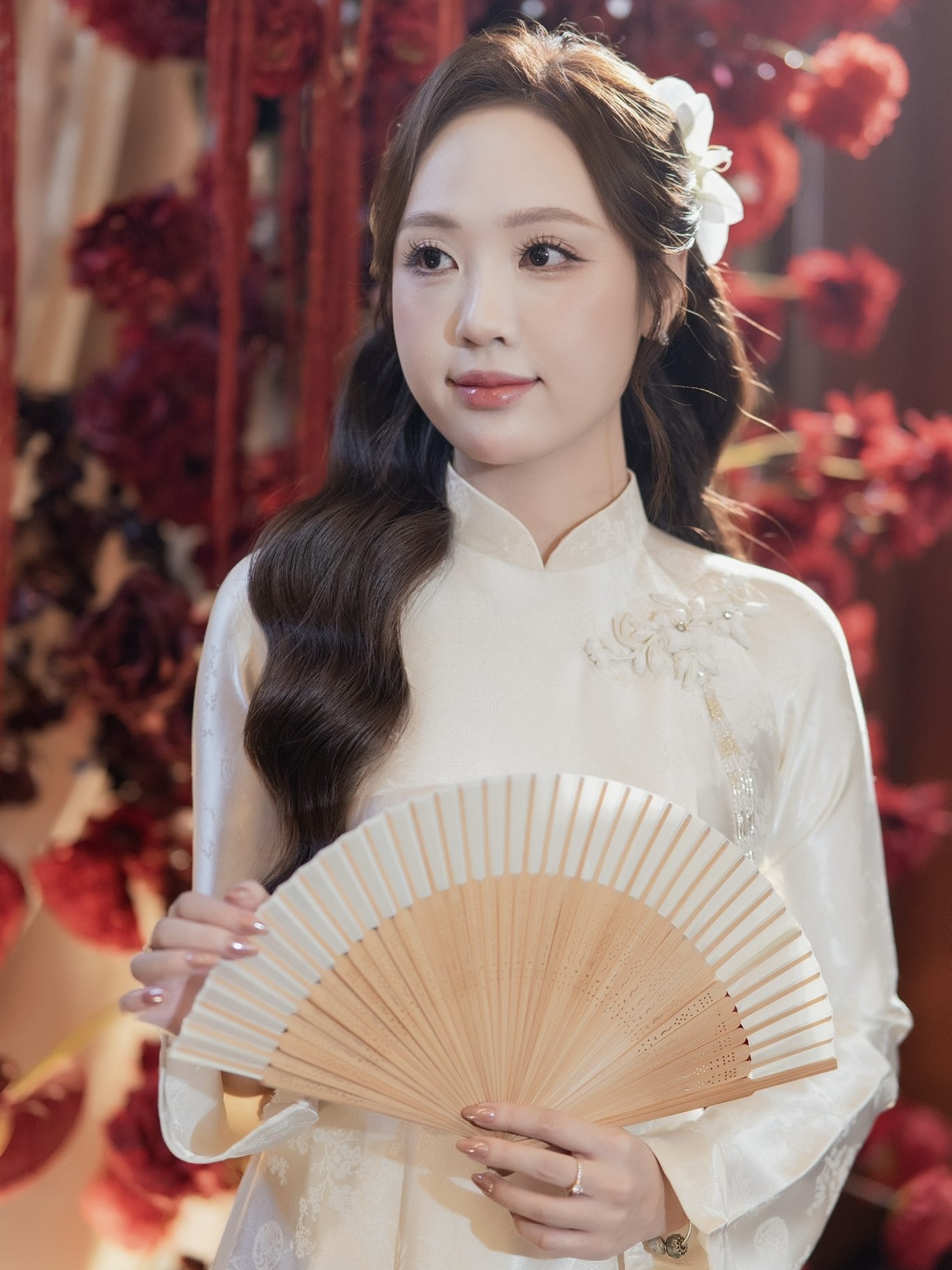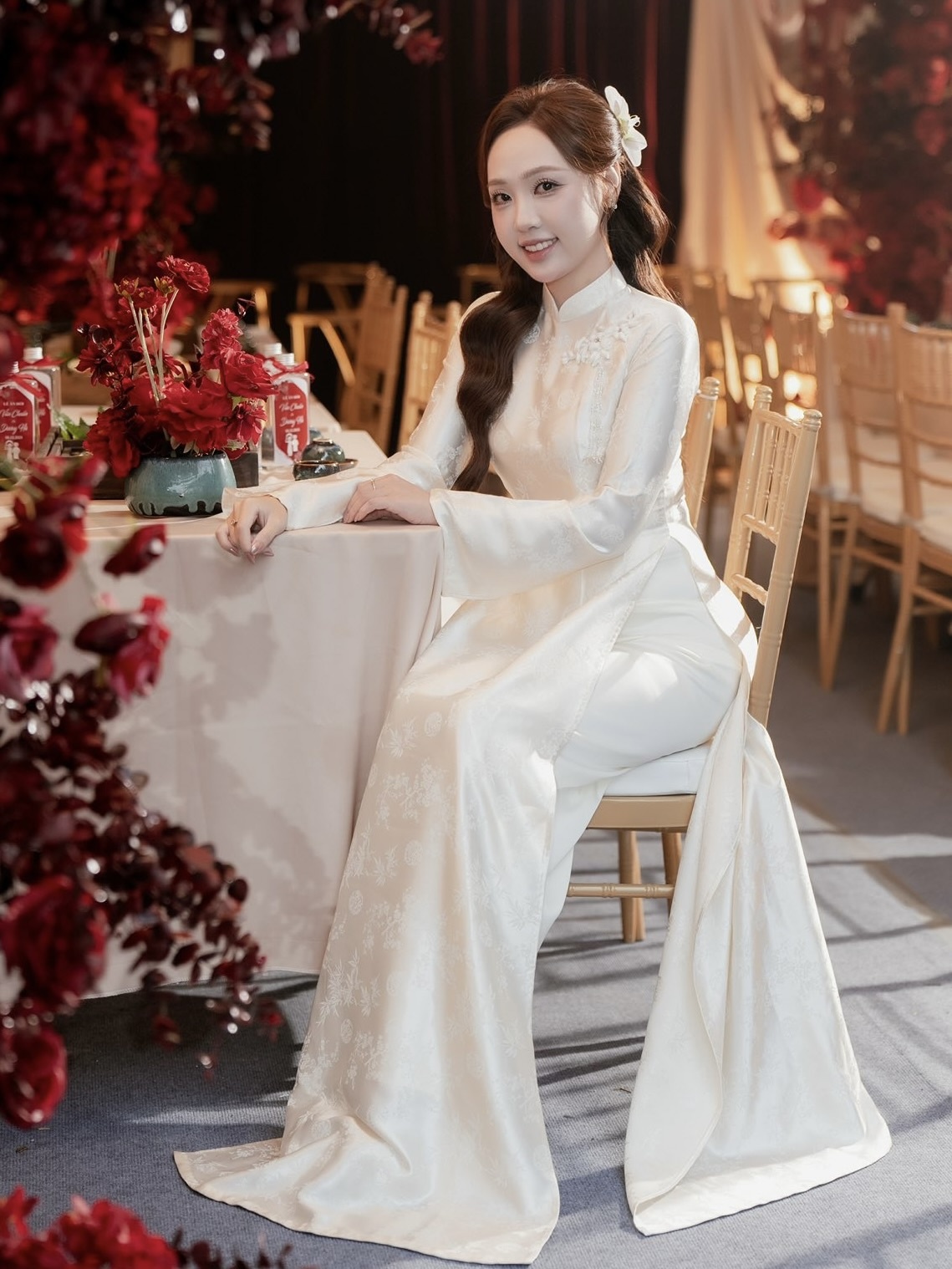 Dương Hà xuất hiện rạng rỡ trong tà áo dài trắng thanh lịch. Vẻ đẹp ngọt ngào của nàng WAG nhận không ít lời khen từ bạn bè, người thân. Thủ môn Văn Chuẩn cũng bày tỏ lời yêu thương với bà xã: "Kể từ ngày hôm nay, chính thức tham gia đầu tư vào dự án 'Nuôi em', kỳ hạn trọn đời, cam kết không rút vốn". Ảnh: duongha.2310/Instagram.