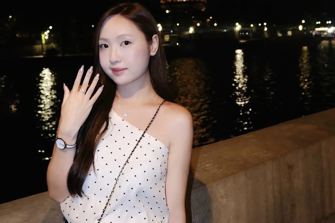 Ngày 7/7, Dương Hà chia sẻ khoảnh khắc được Văn Chuẩn cầu hôn tại tháp Eiffel (Paris, Pháp), đánh dấu bước tiến mới trong mối quan hệ của cặp đôi. Đến tháng 9, nàng WAG đăng tải loạt ảnh thử đồ cưới, nhờ cộng đồng mạng giúp chọn mẫu phù hợp. Ảnh: Dương Hà/Facebook.