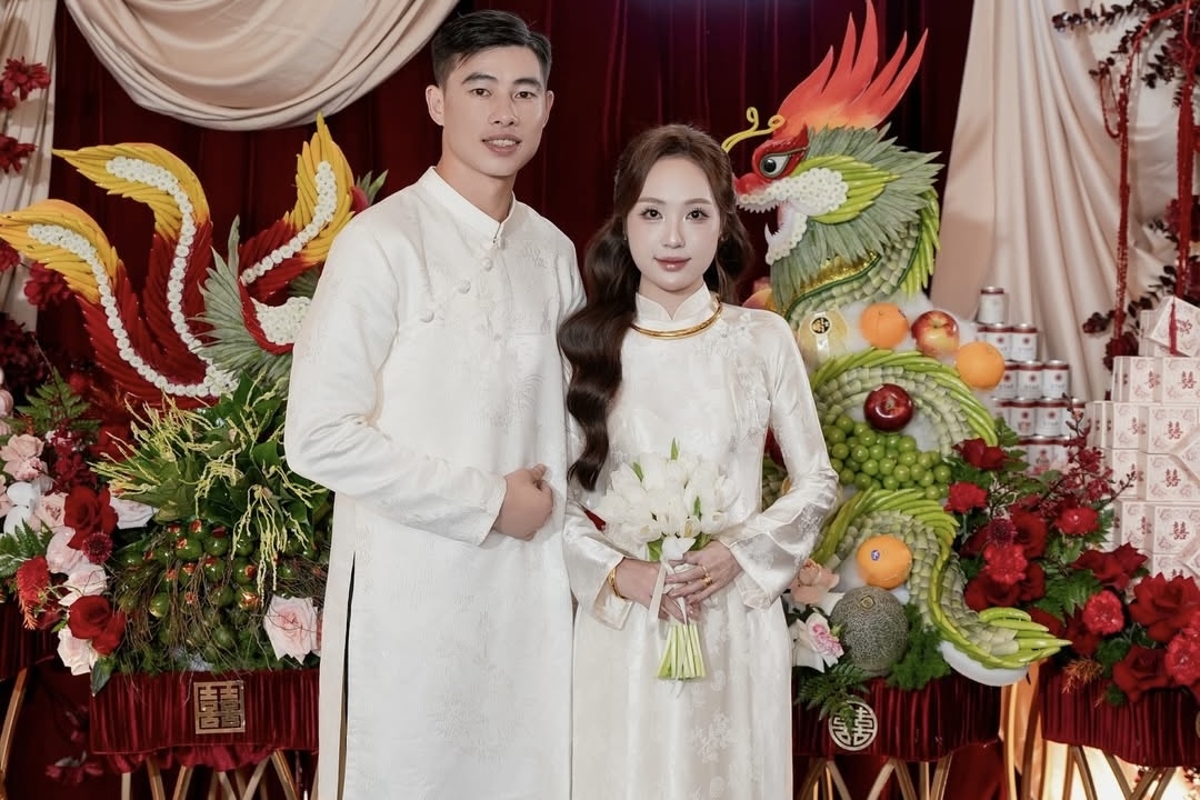 Giữa tháng 12, Nguyễn Vũ Dương Hà (sinh năm 1998) - vợ sắp cưới của thủ môn Quan Văn Chuẩn - thu hút sự chú ý khi đăng tải bộ ảnh lưu lại khoảnh khắc trong lễ ăn hỏi lên mạng xã hội. Cả hai sánh đôi hạnh phúc, cùng bước sang trang mới sau hơn 5 năm yêu. Ảnh: duongha.2310/Instagram.
