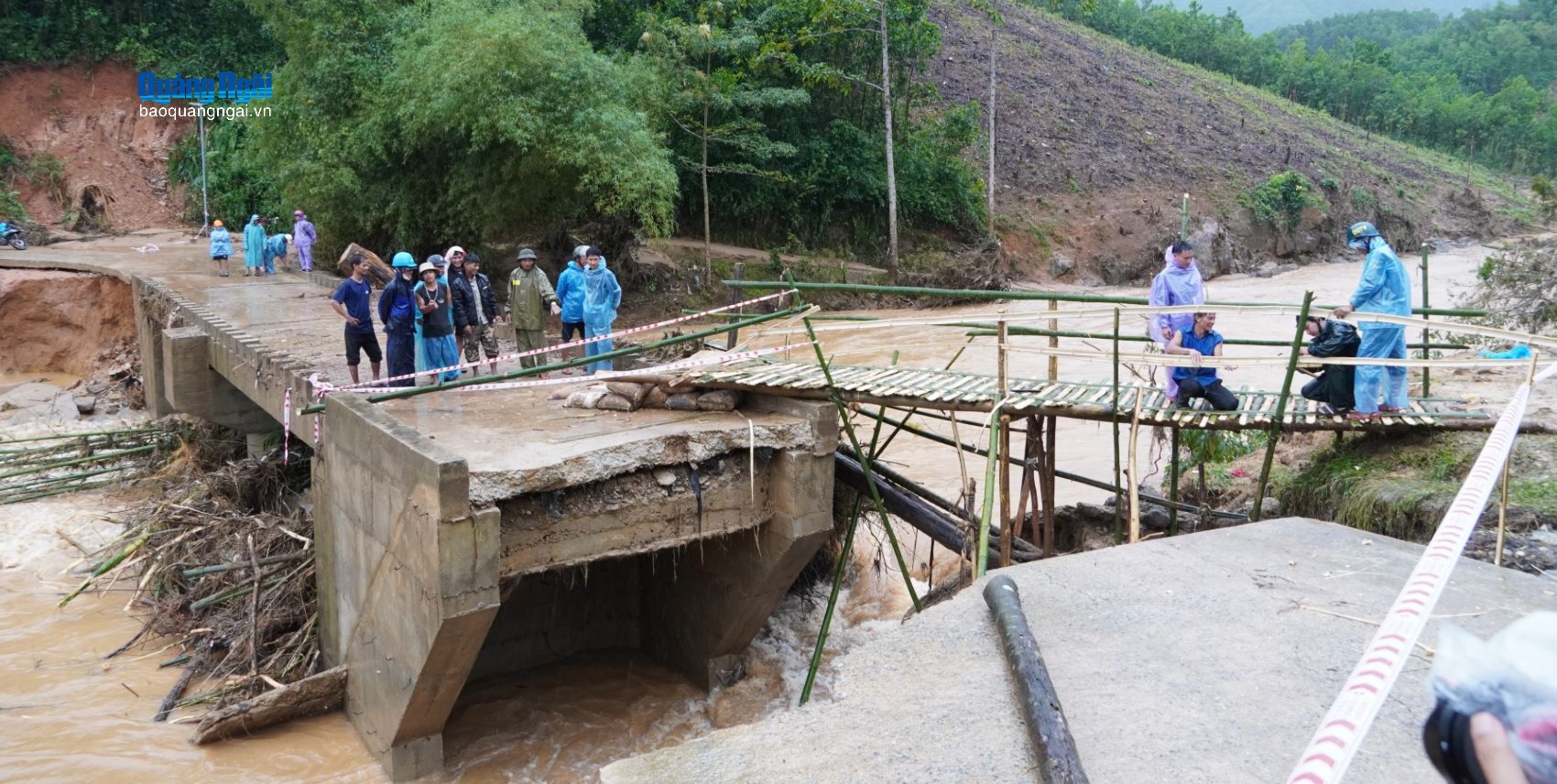 Còn theo lãnh đạo xã Sơn Hà, đêm 16, sáng 17/11, mưa lớn làm nước suối Nước Bao dâng cao, chảy xiết, khiến mố cầu bị cuốn trôi. Do cầu bị hư hỏng, tuyến giao thông qua khu vực bị chia cắt hoàn toàn đối với 280 hộ dân, với 1.212 nhân khẩu ở thôn Mang Nà và thôn Nước Bao.