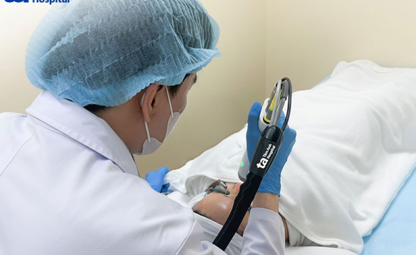 Bác sĩ đang điều trị tình trạng giãn mao mạch cho bệnh nhân sau khi sử dụng mỹ phẩm trôi nổi.