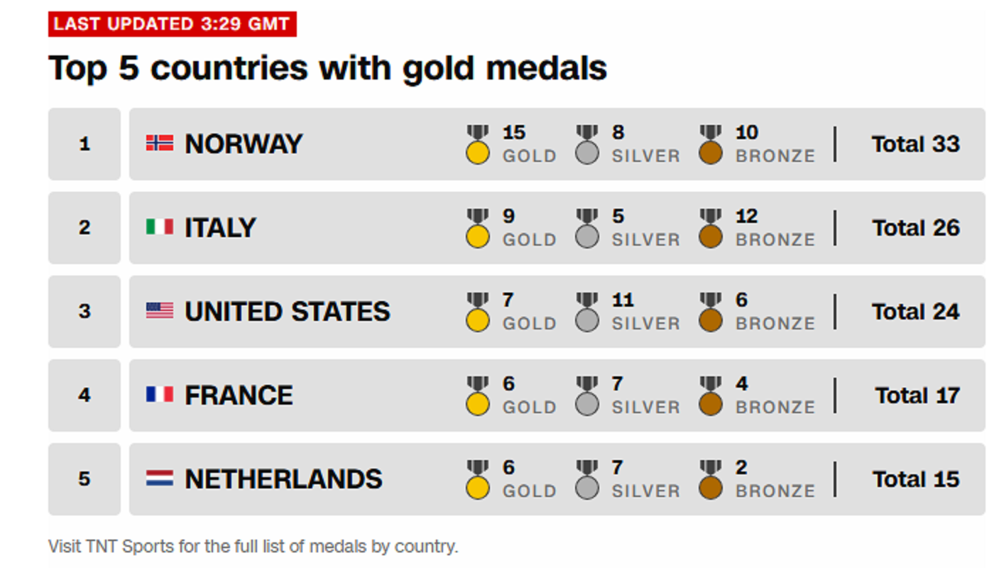 Canada cũng có một ngày thi đấu thành công. Đội trượt băng tốc độ nữ giành huy chương vàng nội dung đồng đội với thời gian 2 phút 55,81 giây, bảo vệ thành công danh hiệu từng đạt được tại Bắc Kinh 2022. Ở môn curling, đội của Rachel Homan đánh bại Thụy Điển 8-6, chấm dứt chuỗi bất bại của đối thủ.